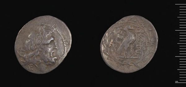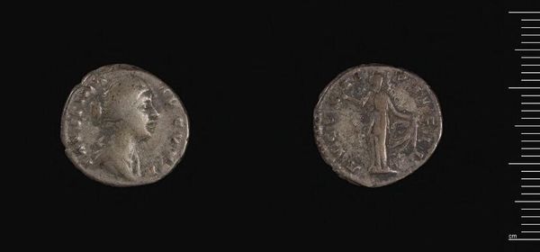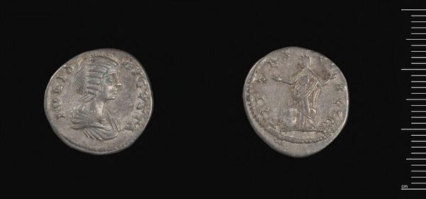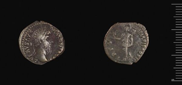 Curator: Here we have a Roman denarius, a silver coin created by L. Julius, a moneyer in ancient Rome. I'm immediately struck by the wear and tear on this coin. It feels weighty, burdened by history. Editor: On one side, we see a helmeted head – Roma, the personification of Rome – while the other features a figure driving a chariot. It speaks to the power and military might Rome projected. Curator: Exactly. The choice of silver as the material speaks volumes about Rome's economic strength and the coin’s role in trade, distribution of resources, and consolidation of power. Editor: Considering that, it's not just an object of exchange; it's a tool of political and cultural propaganda, reflecting the values of the Roman state. Curator: Absolutely. Examining how such a small, commonplace object embodies such complex sociopolitical meanings is fascinating. Editor: Indeed, it gives us a glimpse into the daily realities and the grand narratives of the Roman world.