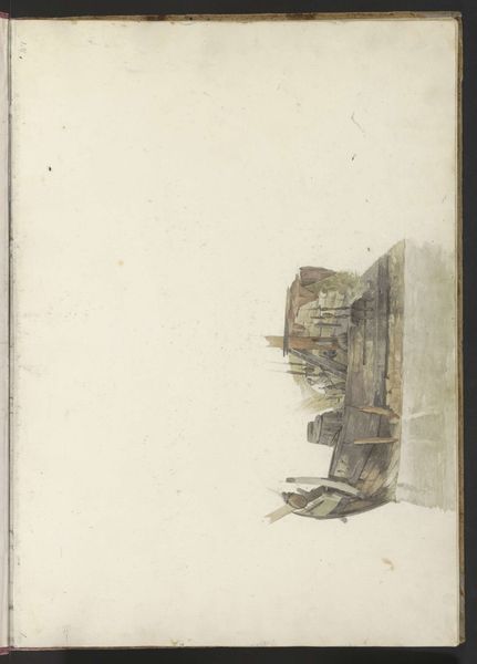 This is Willem Troost's watercolor, "Roofs with Chimneys," housed in the Rijksmuseum. The work presents a fragmented, almost Cubist-like view of urban architecture. Troost’s exploration of form is striking. Notice how he reduces the buildings to geometric shapes, emphasizing lines and planes. The colors—muted browns, blues, and grays—create a somber yet cohesive atmosphere. The varying opacities in the layers of paint suggests depth while maintaining a flat picture plane, challenging traditional perspective. Troost destabilizes our perception of space, inviting a reconsideration of how we perceive and represent the world around us. The sketch reflects a broader artistic interest in deconstructing and reassembling visual reality. Consider how each brushstroke functions as a sign, contributing to a semiotic system where buildings are no longer mere representations but constructions of color and form. The artwork remains a dynamic site for interpreting the interplay between representation and abstraction.