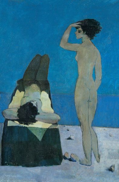 This untitled painting is by Ligia Macovei, who was working in Romania through much of the 20th century. Macovei has employed oil paint, which is very much a traditional choice. But note how she has thinned it down, using it almost like watercolor. This lends a gauzy effect, appropriate to the subject of bathers in a state of undress, at the border between inside and out. There is a sense of immediacy, as though she is painting quickly, keen to capture the light and the vulnerability of these figures. It’s interesting to consider the social context here: this is a culture that was, for many years, quite buttoned-down and conservative, yet Macovei has created a space for an image like this. And it seems, despite its quick handling, it was carefully wrought. The placement of the bodies; the way they turn and angle; the sharp geometry of the architecture framing them. This is a painting that earns its keep. It is a reminder that even the most time-honored materials and processes can yield original results.