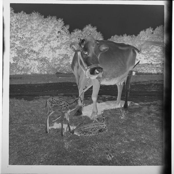 Curator: Jack Gould's compact photograph, which the museum has titled "Untitled (a few sheep wandering around on hillside)", presents a scene of pastoral simplicity. Editor: There’s a certain dreamlike quality to it, isn’t there? The grayscale tones and tight crop give it an intimate, almost melancholic feel. Curator: Indeed, the composition—particularly the stark contrast between the light-drenched sheep and the somber earth—creates a visual tension that speaks to the transient nature of these creatures. Editor: I suppose that looking at this image lets me consider the delicate balance of nature. The artist captured a moment of peaceful coexistence, but it’s also a reminder of our fragile relationship with the land. Curator: That's a lovely reading. Gould’s approach, at least to my eyes, is deeply moving. Editor: Agreed, it is a deceptively simple photograph that resonates long after you’ve turned away.