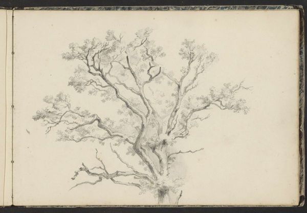 Editor: Here we have "Boom bij Kleef," or "Tree at Kleef," created around 1844 by Johannes Tavenraat, rendered in pencil. I'm immediately struck by the solitude the tree evokes. It's stark and exposed. What can you tell me about this piece? Curator: This work, particularly considering its creation in 1844, exists within a complex socio-political landscape. Landscape art served, in part, as a way to negotiate emerging national identities and sentiments, specifically in post-Napoleonic Europe. Think of the Romantic movement's emphasis on nature. Editor: So, landscape wasn’t just about pretty scenery? Curator: Exactly. This image reflects the growing awareness and investment in one’s immediate surroundings. Note that Tavenraat's choice of medium makes it instantly more accessible and understandable to the everyday viewer. How do you think that might have affected its reception at the time? Editor: Well, using a more accessible medium probably broadened its appeal and potential political impact by making it available to the wider public and less elitist than perhaps oil paintings. Curator: Precisely! Art becomes less about unattainable beauty and more about sharing accessible moments with a recognizable public. Landscape becomes a shared experience. It helped solidify a sense of belonging. We have to consider how things like aesthetic choices and display create access for wider audiences and shape the meaning that audiences take away. Editor: I’ve never considered landscape in terms of cultural impact before; that's insightful. I’m taking a new perspective away from this discussion! Curator: I agree, these landscapes represent not only physical spaces, but evolving perceptions of community in relation to nature. Looking at art through the lens of historical context truly enriches our appreciation.