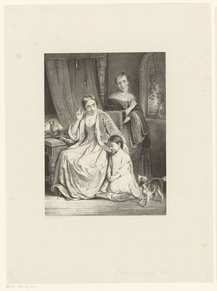Editor: Here we have Frederik Hendrik Weissenbruch's "Drie jonge vrouwen," made with pencil around 1855 to 1865. It's currently housed at the Rijksmuseum. I'm immediately struck by the softness of the pencil and the incredible detail in their clothing. What do you see in this piece? Curator: Well, looking at this drawing, I’m immediately drawn to the materials and process. Pencil wasn’t just a readily available medium; its use speaks to accessibility and the potential for mass production of images through reproduction techniques that were developing at the time. Notice the different densities of shading - this indicates layers of graphite, which highlights a specific set of labor, that the artist goes over to reinforce the contrast in what areas, if it where just one time pencil is ran through a paper that would have not worked. Editor: So you're saying the choice of pencil and the artist's technique reveal more about its historical context than, say, just personal expression? Curator: Precisely. Consider how portraits were traditionally rendered. This choice of a “humble” material makes us rethink about who had acess, about how it circulated...The artist may have actively questioned established traditions. Moreover, notice the hands of the figures—what does their depiction suggest about the role and status of women during the mid-19th century? Are they at leisure, occupied by “appropriate” pursuits? Editor: It is a really captivating thing when it comes to status… It’s fascinating how analyzing material choices opens up a whole new avenue of interpretation. Curator: It indeed does. Paying attention to material choices invites us to investigate the broader historical, social and cultural conditions surrounding the artwork’s production and reception. Editor: This has really changed the way I see the artwork. It makes it all the more relatable when it seems like materials speak on their own.