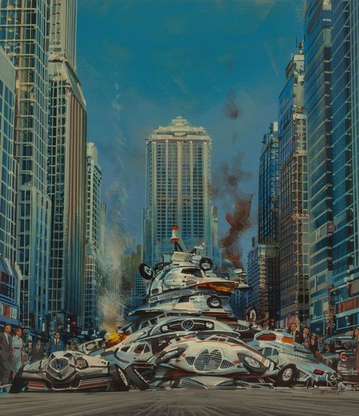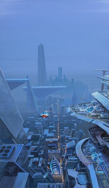 John Conrad Berkey made this Otis Elevator advertisement, with I'm guessing, oil on board. Looking at his brushwork, you can tell artmaking for Berkey was very much a process. The paint application is super interesting; it's thick in some areas and thin in others, creating a wonderful texture that adds depth to the futuristic cityscape. The color palette is restrained, mostly whites and blues, but there's a real vibrancy in how they're applied. Take a look at the top of the main building, where Berkey uses quick, gestural strokes to create the domed roof. It's almost as if he's building up the structure right before our eyes. You can almost feel the energy and movement in his process. Berkey's work reminds me a bit of Chesley Bonestell, another artist who explored the aesthetics of science and technology, but with a more painterly, expressive approach. It's cool how artists can interpret similar themes in such different ways, right? And it just goes to show that art is always a conversation, an ongoing exchange of ideas across time.