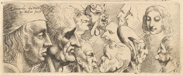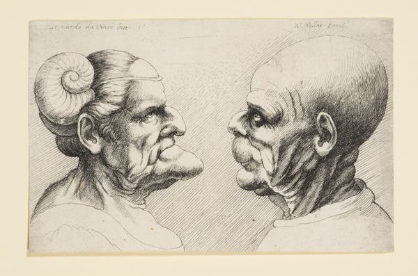 Wenceslaus Hollar created this print called ‘Five Grotesque Heads, including an elderly man with an oak leaf wreath’ some time in the 17th century. Hollar was born in Prague, Bohemia, during a time of immense religious and political conflict, which shaped his life as a refugee and artist. This print, now residing at the Metropolitan Museum of Art, presents us with a cluster of faces, each rendered with a distinct and exaggerated expression. The man crowned with an oak wreath, a symbol of honor, is surrounded by figures expressing a range of emotions. What are we to make of these grotesque visages, caught between laughter and torment? Hollar lived through the Thirty Years' War, witnessing firsthand the ravages of conflict and displacement. His work often reflects a deep understanding of human suffering and resilience. Consider how the grotesque, often marginalized in art, is given prominence here. Hollar asks us to confront the uncomfortable aspects of the human condition. This work invites us to reflect on the interplay between personal experience and collective trauma, challenging traditional notions of beauty and heroism.