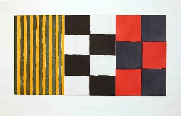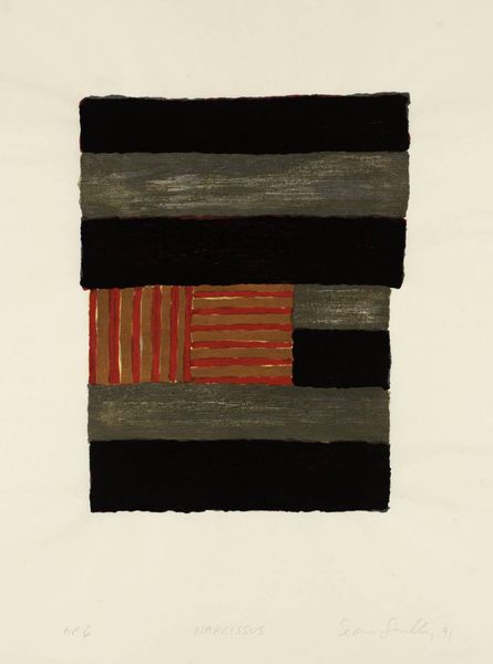 Editor: So, this is Sean Scully's "Mexico Calpulli," a watercolor drawing from 1983. It has a definite boldness with the stripes, but also a kind of playful quality because of the washes of color. What catches your eye in this piece? Curator: The title immediately pulls me in. "Calpulli" refers to a pre-Columbian organizational unit, a clan-like group. Given Scully's abstract style, these colored bars may symbolically represent the structured relationships and societal layers of such a community. Notice how he contrasts vertical and diagonal stripes? What feelings do they stir? Editor: The vertical ones feel very stable, while the diagonals are much more dynamic, even a bit rebellious. Curator: Exactly. And think about color. The warmth of the yellow and red… does it suggest something about the cultural identity being referenced? Watercolors often possess transparency and immediacy; in that light, does this suggest cultural transparency or even vulnerability? Editor: I hadn't thought about vulnerability, but it makes sense considering the historical context. The imposition of outside forces potentially destabilizing a structured group. Curator: The stripes also suggest boundaries, maybe even confinement. Are these divisions strengthening or fragmenting this Calpulli? It's interesting to consider what these abstract elements evoke, hinting at cultural resilience or perhaps cultural conflict. Editor: This is making me think about how abstraction isn't necessarily divorced from the real world; it can carry so much cultural memory. Thanks. Curator: Precisely. Seeing how seemingly simple forms communicate such complex layers—that's the beauty of art history.