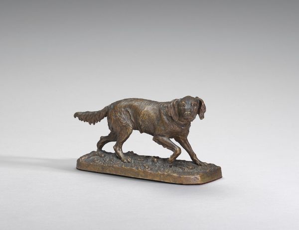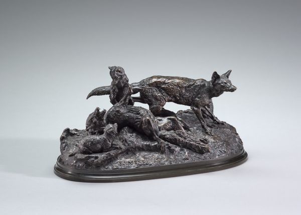 Curator: Theodor Philipsen’s bronze sculpture, "En so med fire grise," or "A Sow with Four Pigs," dates from 1906 and resides here at the SMK, Statens Museum for Kunst. It is truly a sight, isn't it? Editor: It's charmingly domestic, though also a bit unsettling. The raw realism is almost…confrontational. Curator: Confrontational? How so? I find it rather comforting, a celebration of pastoral life. Consider how pigs throughout time symbolize prosperity, abundance, good fortune. Do these symbols ring true for you? Editor: Yes, but there's an intensity in their interaction. The sow is massive, protective, almost looming. And the piglets clustered so desperately, their little backsides creating a sort of visual rhythm. It's very tactile. How did the society that consumed it affect the statue's reputation and purpose, you think? Curator: The bronze material grants this small artwork a sense of timelessness and value. And this particular scene presents a narrative accessible across various cultures. Though cast in the early 20th century, its symbolism dates to antiquity when the figure of the sow represented fertility and the well-being of the home. It seems Philipsen understood that collective symbolism when producing the bronze. Editor: True, and Philipsen wasn't creating this in a vacuum. The rise of industrialization in the early 20th century likely created nostalgia for this vision of rural simplicity and close knit connection. How interesting that an artist, Philipsen, could contribute to the rise of such ideas in the broader socio-cultural landscape of his home. Curator: The sow stands for safety. One could perceive in the protective posture a potent symbol, both personal and universal, that transcends place or period. Editor: So we might say that Philipsen captured something lasting. The bronze, this artwork, exists to us now as a portal—linking personal security with broader concerns about connection. It all points back to this very human need for stability and familiarity. It makes you wonder: how will future audiences regard the symbol that has sprung from a farmer's pigs in a field? Curator: An intriguing question, certainly. One I find myself considering anew. Editor: Indeed. Perhaps this piece makes one ruminate about how fleeting stability truly is.