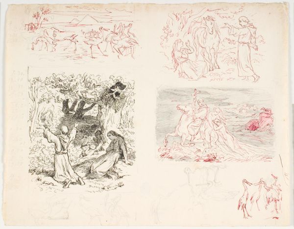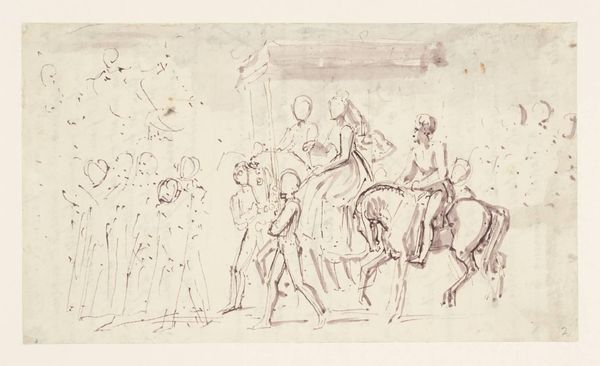 Editor: This is James Seymour's "Horses in a Stable, Grooms, Etc.," from the Tate Collections. It's a quick sketch, mostly in brown ink, showing horses and figures. The composition feels a bit fragmented. What do you see in this piece? Curator: Seymour's sketch provides a glimpse into the 18th-century equestrian culture, where horses symbolized wealth and power. Notice how the figures attending the horses, perhaps grooms, are relegated to supporting roles? Consider the social hierarchy implied in this seemingly simple stable scene. Editor: So, it's not just about the horses themselves, but what they represent in society? Curator: Precisely. The sketch subtly reveals the power dynamics of the time. What does it tell us about labor, status, and the relationship between humans and animals? Editor: It makes me think about who gets to be the subject of art and whose stories are often left out. Curator: Exactly. Art isn't created in a vacuum. It reflects and reinforces societal structures. Editor: I see the drawing in a whole new way now, understanding it through a social lens. Curator: Exploring art through these intersectional perspectives allows us to have deeper conversations about our past and present.