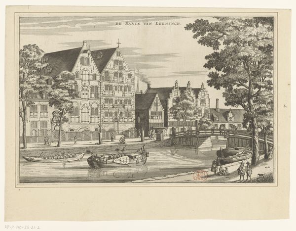 Curator: The artwork before us, titled "Gezicht op het Athenaeum Illustre te Amsterdam," was crafted between 1663 and 1664 by Jacob van Meurs. It's currently held in the Rijksmuseum's collection. Editor: It has a very balanced composition. The verticality of the buildings and trees is nicely countered by the horizontal water, creating a serene and ordered feel. Curator: Indeed. Van Meurs used ink and engraving techniques to depict this cityscape. We see line work that emphasizes form and perspective. Consider, though, the economic context. Printmaking like this was relatively accessible; it democratized images of Amsterdam for a growing merchant class. Editor: Absolutely, but note how the repetitive lines create depth and texture. The tonal range is limited, yet he manages to suggest light playing across the facades and foliage with variations in line density. It gives definition to form and structure of the buildings, very crisp lines. Curator: Think also of the labor involved in such detailed work. Each line is a product of careful crafting and contributes to making such print and images of Amsterdam available. What would it mean for them to acquire them, see their homes reproduced, exchanged? It all added to the making of Amsterdam identity at the time. Editor: While I recognize that labor is essential to art production, the interplay of light and shadow here creates a sophisticated composition with rhythmic arrangements; see how the forms relate, divide the space and convey meaning with the various formal elements employed by Van Meurs! The formal choices lead the viewer’s eyes on a well-structured composition. Curator: Of course, we can consider the engraving simply on terms of composition or effect. But ignoring the materiality and conditions of making means missing a great deal of historical understanding and impact the image would have then. Editor: Perhaps, but looking through this particular arrangement of line, form, texture and light in relationship provides its own meaning, reflecting back to us the era that developed it and offering to us to learn new concepts through a language all its own. Curator: That’s interesting to consider; thank you for bringing new context to my understanding of it. Editor: Likewise; it’s valuable to consider this piece's physical creation and place in the world, alongside its form.