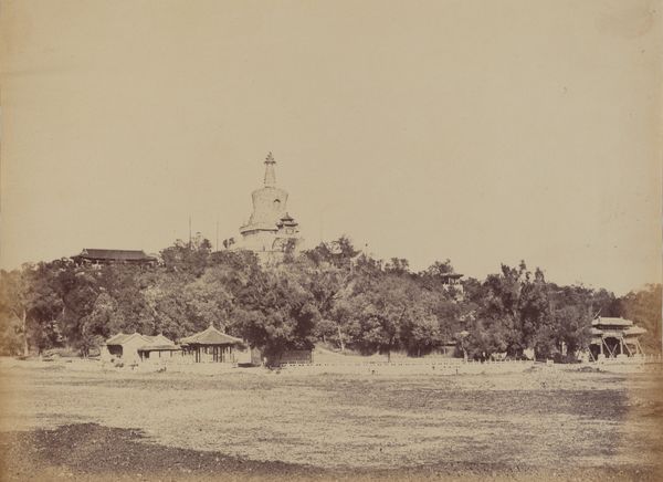 Editor: This photograph, “Dum Dum Church,” was captured by Captain R. B. Hill in the 1850s using the albumen print process. The linear perspective immediately strikes me; it's quite rigid. What do you see in this composition? Curator: Indeed. Note how the architectonic forms present a Neoclassical precision, even austerity. The light, too, models the crisp geometry of its subject with almost didactic clarity. The balanced symmetry and subdued tonal range underscore a mood of solemnity. Observe how the tripartite division of the façade is mirrored in the verticality of the bell tower, asserting an implicit visual hierarchy. Editor: The symmetry you mentioned... it’s almost too perfect, perhaps lacking a dynamic element? Curator: Yet, paradoxically, consider how the subtle gradations within the print—the minute shifts of tone and texture—counter this perceived rigidity. The delicate details wrought by the albumen process add an indexical depth, enriching our formal apprehension. The presence of human figures, though diminutive, offer scale, inviting comparative assessments. Is that convincing as a compositional justification? Editor: I see what you mean about scale, and I agree that those subtle tones do soften the stark geometry somewhat. Perhaps it's not just about symmetry, but the interplay between geometric forms and the softening effect of light and shade? Curator: Precisely. And, should we pursue that thread, it provides the key through which we can more rigorously formalize the print's implicit dialectic between the structural and the sensual. Editor: I am glad I asked your opinion because now I notice a dynamic play in its detail that wasn't there at first glance.