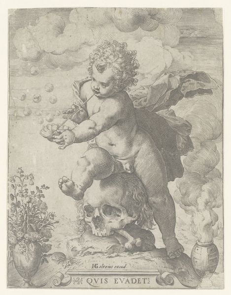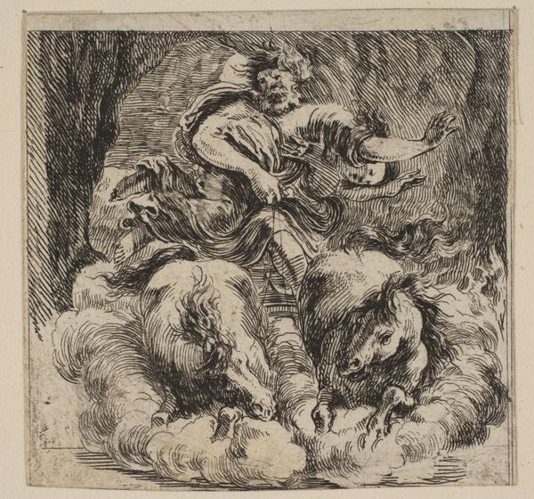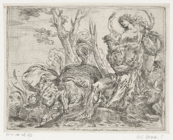 Stefano della Bella created "Venus et Adonis" using etching, a printmaking technique that relies on the corrosive power of acid. The plate would first be coated with a waxy, acid-resistant ground. The artist then scratches an image into the ground with a needle, exposing the metal beneath. The plate is then immersed in acid, which bites into the exposed lines. The longer the plate remains in the acid, the deeper the lines become, resulting in darker, more pronounced lines in the final print. To create a print, ink is applied to the plate, filling the etched lines. The surface is wiped clean, and the image is transferred to paper under high pressure. Note the contrast between the delicate lines used to render Venus's distress, and the more densely hatched areas that create shadow and depth. This finely-wrought work speaks to the skill and labor involved in the intaglio process. It's a good example of how even a relatively "mass produced" image like a print bears the distinct trace of the artist's hand, challenging the separation of art from craft.