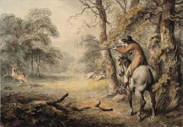 Editor: So, this is Gustave Courbet's "After the Hunt," painted around 1859, using oil on canvas. The stillness of the scene feels unsettling given its subject; it almost feels theatrical. What strikes you when you look at it? Curator: The composition immediately raises questions about the culture surrounding hunting in 19th-century France, and how that culture manifested itself publicly through paintings like this one. How does Courbet choose to depict the hunter and the hunted? Editor: He seems to position the hunter almost nonchalantly amongst the carcasses, as if surveying the scene with detachment. The dogs look more excited than the man does. Curator: Precisely. This highlights a significant aspect of art's public role. While appearing to simply depict a hunt, the painting engages with complex socio-political dynamics. Hunting was increasingly regulated, becoming intertwined with ideas of class and privilege. Does this resonate in how the "common man" is absent? Editor: I see what you mean. The focus isn't really on the act of hunting, but more about its display, the outcome and almost like the aftermath in terms of demonstrating power dynamics, rather than the action. Curator: Indeed, Courbet, known for his realism, often subtly critiques societal norms. The very act of exhibiting this ‘trophy’ scene challenges, perhaps, the perceived heroism of the hunt. Consider how the staging affects your understanding. How is hunting positioned within this pictorial space and its intended audience? Editor: It almost makes me uncomfortable, given my modern perspective on animal rights. Though I wonder, did viewers at the time have a similar response, or did they view it as merely documentation of an aristocratic pass time? Curator: It is this historical lens that offers new and insightful ways of relating to art from bygone eras. Editor: Absolutely, I’ve never thought of genre painting being a political display! Thanks!