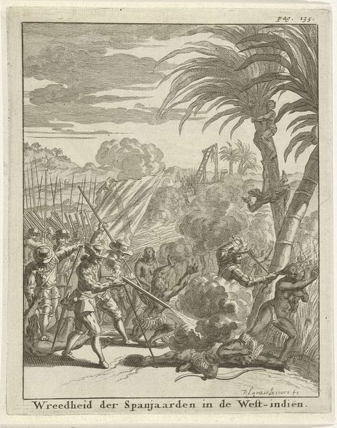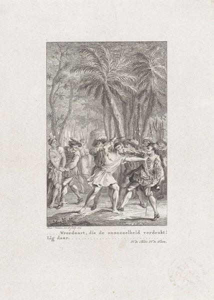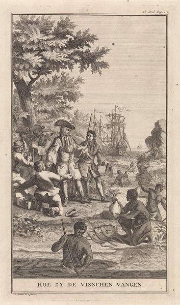 Editor: This is “Slavenhandel,” or Slave Trade, an engraving from somewhere between 1758 and 1829, housed here at the Rijksmuseum, by Theodoor Koning. The detail is incredible, but the scene is really disturbing; a man is being exchanged between two European traders. What strikes you most about this work? Curator: Well, first off, that ornamental border! It frames a horrifying reality with…almost a sense of Baroque celebration. Don't you think? That tension hits you right away. It's a gut punch framed in pretty paper. It’s not just the transaction itself but the composed nonchalance around it; other people are in the background like the man's body is something like cloth, right? Editor: Absolutely. It feels deliberately jarring. Were prints like these meant to inform, or to persuade? Curator: I'd wager both. Prints were, pardon the pun, instrumental, spreading abolitionist ideas alongside straightforward record keeping. See the ship in the background? And those men trading the slave on the coast? Imagine a 17th-century meme – shocking imagery circulated widely to fuel discussion and, hopefully, action. How effective were those prints like “Slavenhandel”, after all? Editor: I see what you mean, circulating to start discourse... Looking at the body language in the work itself makes you feel… things. Thank you so much, this was eye-opening, especially considering what prints meant to circulate news. Curator: My pleasure. Art’s power lies, I think, in turning seeing into feeling, which could be so much more productive in turning our future discourse.
