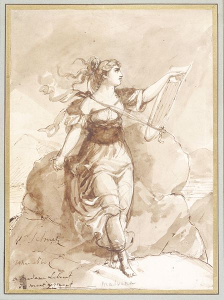 Editor: Here we have a watercolour drawing by Peltro William Tomkins, from somewhere between 1800 and 1849, called "Woman floating in the sky, observed by a cherub". It's dreamlike. It looks like an angel ascending or a muse inspiring some sort of creation. I wonder how an image like this would function culturally at that time. What's your take on it? Curator: It’s fascinating to consider this drawing in the context of Romanticism, particularly its fascination with the ethereal and the idealised female form. Images of women, like this one, often served as allegories, representing abstract concepts like liberty, virtue, or inspiration, carefully constructed within social norms. Editor: So, the woman isn't just a woman, she represents something else? Curator: Precisely. Consider how the institution of art academies shaped artistic production then. They codified what was deemed "beautiful" and "appropriate". This work plays with these established notions, but also reinforces them by presenting a passively beautiful and seemingly docile figure. The presence of the cherub further elevates the scene, adding religious and artistic validation. Editor: That's really interesting. I hadn't considered the art academies' influence. Curator: Think about how such imagery reinforced societal expectations of women. How does the composition itself contribute to this idealization? Note how the woman is presented passively, floating rather than acting. What might that suggest about the roles women were expected to occupy at the time? Editor: I suppose she is floating and observing. The cherub is, too! They’re both in this heavenly space…So, the artwork tells us as much about art history as it tells us about history and social structure, right? Curator: Exactly! It encourages us to interrogate the social, cultural and political framework which shapes an image and which dictates how and where images are exhibited, then and now. Editor: This gives me so much to think about when looking at art of this period. Thank you for clarifying. Curator: My pleasure. The politics of imagery are endlessly fascinating.