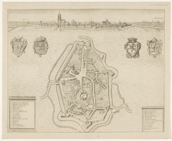Reynier Blokhuysen’s ‘Plattegrond van en gezicht op Diksmuide’ presents a meticulously etched composition that marries cartographic precision with artistic flair. The city’s layout is structured with linear precision, where buildings and fortifications are depicted as a series of geometric forms, conveying a sense of order and control. Blokhuysen employs a dual perspective. The plan view offers an objective, almost scientific representation of the urban space, contrasting with the elevated view of Diksmuide as a defensible and sovereign entity. This interplay reveals the dialectic between representation and power; the map serves not only as a navigational tool but also as a symbol of urban governance. The heraldic emblems and detailed rendering of architectural landmarks—the church, the windmills, and the city gates—transform the map into a complex semiotic field. Here, each element acts as a signifier of social, economic, and military significance. The map serves as a statement about the city’s place in the broader political landscape of its time, with the linear precision of the city plan, acting as a metaphor for the rational ordering of society.