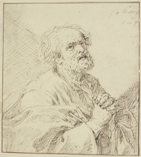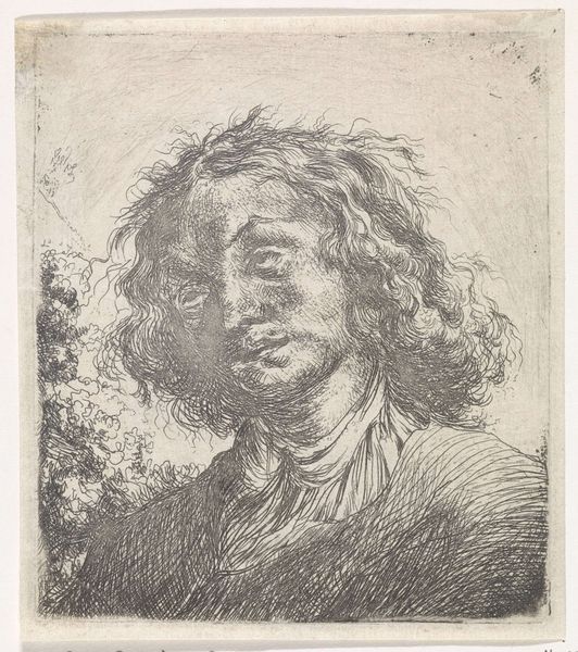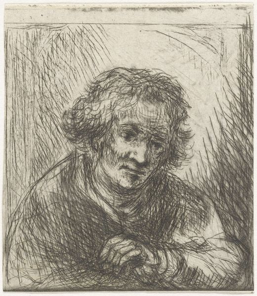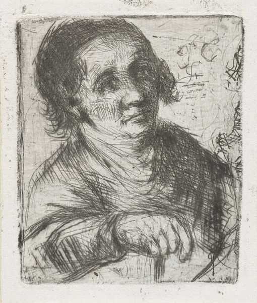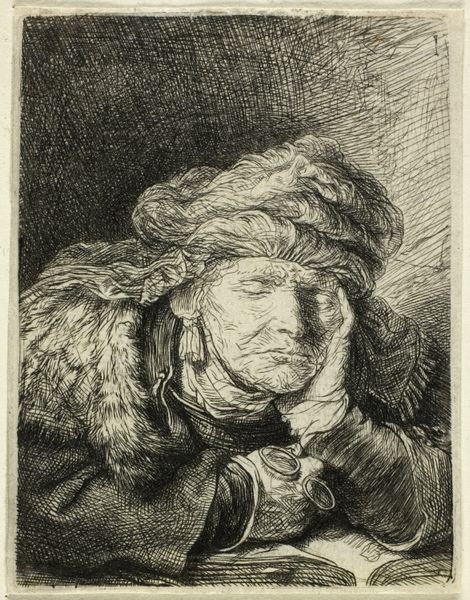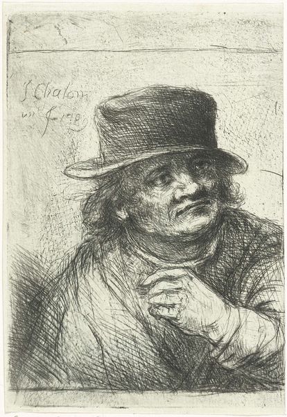 Editor: This is Jan Chalon's "Volwassen man," or "Adult Man," an etching made sometime between 1748 and 1795. I'm immediately drawn to the raw texture of the lines and how they seem to capture not just a likeness, but also the weight of experience etched on this man's face. What do you see in this piece, with its striking realism? Curator: I see a tapestry of time, woven into the very fabric of the image. Chalon doesn't just present us with a portrait; he offers a glimpse into the symbolic landscape of aging, mortality, and the indelible marks life leaves behind. The subject's turban-like head covering, what significance might that have had in the period? Editor: I hadn’t considered that – it makes me wonder about social status, perhaps? Curator: Precisely. Turbans carried diverse symbolic weight. And observe how the web of lines around his eyes and mouth—almost hieroglyphic—suggest hidden narratives. It speaks to a kind of psychological unveiling through symbolic marks, like the visual echoes of memories. Doesn't the tight hold he has of his clothing also indicate some discomfort, either physically or perhaps a reluctance to be observed? Editor: That's insightful, I hadn’t thought about his posture adding to the story. Now I see more vulnerability in his expression. Curator: And vulnerability humanizes, providing an enduring psychological landscape, no? An Iconographer sees layers of stories inscribed onto the visible surface, inviting a richer, more profound interpretation beyond mere representation. Editor: This has really deepened my understanding; I now see the portrait as so much more than a snapshot in time. Curator: Indeed. Hopefully this enriches our engagement with portraits generally; the visual symbols offer continuity and profound stories through history.