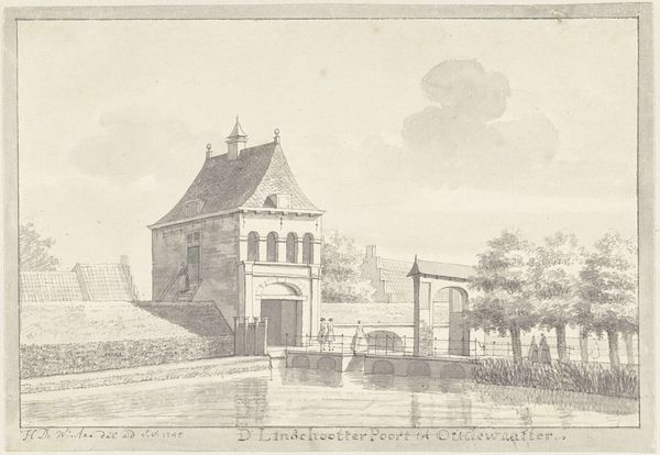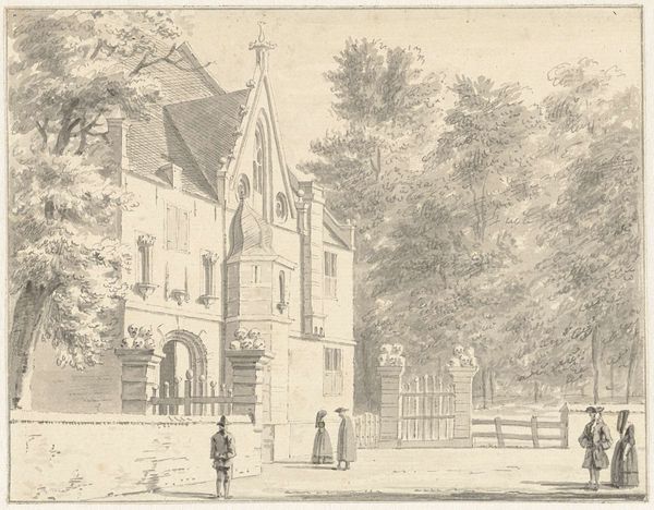 Curator: Here we have Hendrik de Winter's 1745 ink drawing, "The Orphanage and the Warehouse at Oudewater," now residing at the Rijksmuseum. A classic Dutch scene rendered with such delicate lines. What's your first impression? Editor: A wistful calm. The subdued greyscale tones create this almost dreamlike atmosphere. It’s the kind of image that invites quiet reflection. The architecture seems to breathe history, doesn’t it? Curator: Absolutely. Orphanages, in art, frequently use architecture to imply security or protection; like a solid promise etched in stone. Consider, here, the careful, almost loving detail rendered on these solid, rectangular structures—how might this communicate a civic intention? Editor: It is interesting to consider the symbols chosen. Notice how the orderly rows of windows resemble watchful eyes. Perhaps symbolizing vigilance, care or surveillance over those residing within? Even the solitary figure seemingly measuring or maintaining the perimeter amplifies this feeling of curated protection. Curator: An intriguing point about vigilance and curated protection through symbolism. I love that! The man measuring - and thus, claiming or designating - along the perimeter hints at ownership or, at the very least, meticulous civic planning. The controlled perspective directs our eye, positioning the warehouse alongside the orphanage—emphasizing this link of civic responsibility in practical storage. Editor: A tangible embodiment of community interwoven; those parallel responsibilities of care and provision. These simple visual relationships express volumes about social priorities. Also, isn't it interesting that the tallest, most elaborate feature of this architectural landscape is not the institutions themselves, but the large, dominating tree in the middle? To me, the prominence and care given to this single tree is a reflection on the community's vision of natural abundance for a prosperous future. Curator: It definitely softens the rigid geometry of the buildings, doesn't it? You know, spending time with this artwork highlights a central question: How much is revealed about a culture's values when examining their careful arrangement of space? Editor: Precisely. And De Winter’s piece seems to whisper that story beautifully through its meticulous lines and carefully considered forms.