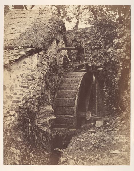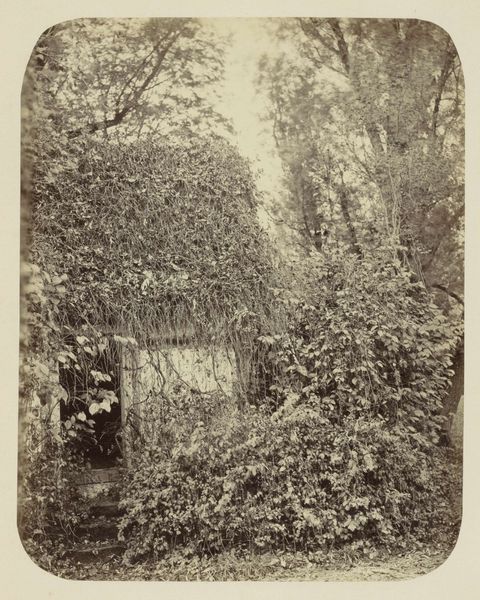 Editor: This photograph, "[Rustic Building with Man under Trellis]" by André Giroux, dating from around 1851-1855, presents a building partly obscured by lush foliage. I'm struck by how soft and timeless the image feels. What layers of symbolism do you see at play here? Curator: This image speaks to the enduring human connection with nature and shelter. The building, solid and aged, represents permanence and perhaps a rooted history. Notice how the trellis, covered in vines, softens the rigid structure. Editor: I do. There is this very pronounced contrast, so you have that architectural presence alongside these natural forms; it gives off the impression of nature reclaiming the built world. What would you read into that? Curator: The tension you perceive between nature and architecture could symbolize a broader commentary. Does nature dominate, or does the structure hold its own? Think about the period, a time of rapid industrialization, urbanization and the birth of environmentalism; images like these reflected both anxieties about this shift and yearning for a more natural existence. Editor: So, the overgrown trellis could stand for the allure and inevitability of the natural world, contrasting against rigid societal development? Curator: Precisely. The man under the trellis is nearly swallowed in shadow. What meanings could reside in that shadowed form? Editor: It could evoke vulnerability, the individual dwarfed and protected, yet almost concealed, by nature. Is the image cautionary or celebratory? Curator: Both. It’s a dialogue, not a decree. Editor: I hadn’t thought of it that way. Thanks, seeing it through that lens clarifies its depth. Curator: My pleasure. Each viewing will add to your own understanding.
