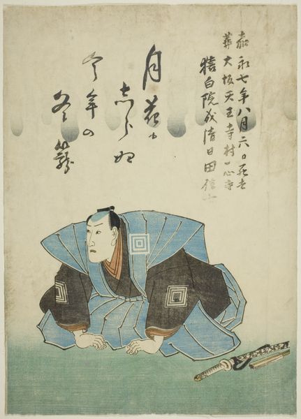 Curator: Take a look at "(Spear holder)", a print by Shibata Zeshin, likely crafted in the 19th century. It's a toned paper print made with ink, and currently part of the Minneapolis Institute of Art's collection. What catches your eye initially? Editor: Well, it's certainly making me chuckle! The reclining figure looks rather…unceremonious. A spear beside him, a half-empty sake cup...it's like a scene from a comedic play. There’s a relaxed, almost rebellious air to it. Curator: Indeed. Zeshin was a master of ukiyo-e and often incorporated humour into his work. The figure’s languid pose, contrasted with the spear – a symbol of military duty – presents a wonderful contradiction, wouldn't you say? It's a wry comment on social roles, perhaps. Editor: Absolutely. And think of the spear itself. A potential instrument of power, here almost an afterthought. It makes you consider the burdens of tradition and the temptation to simply…nap it off. Plus, the inclusion of a caricature style adds to its whimsical sensibility. I notice a lot of genre-painting features too. Curator: The beauty of Japanese art often lies in its subtleties. Though humorous on the surface, consider the cultural implications. The "warrior" is resting but has his sword near him, which shows some responsibility for possible combat; meanwhile, all this action is summarized through caricature! Is he a soldier on break, maybe? Or something else? I’m very fascinated by such details. Editor: It raises an interesting question about perspective. Is it glorifying leisure or critiquing it? The composition definitely has some nuance! And what do you read from the calligraphic inscription filling most of the surface? Curator: Unfortunately, I don't read Japanese... Maybe an expert on the subject could enrich our talk, to have a proper look to its orientalism symbols. Either way, Zeshin asks important questions with such pieces. Editor: This print delivers much beyond immediate amusement. It cleverly weaves satire, societal commentary, and symbolic counterpoints into an intimate moment of unexpected, carefree surrender. Curator: Exactly! The enduring power of Zeshin, really—isn’t it? He uses seeming simplicity to prompt ongoing conversations.