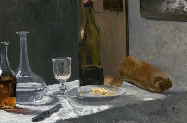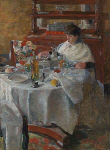 Curator: Sargent's "My Dining Room," painted in 1885, offers a glimpse into a personal space, rendered in his signature impressionistic style. Editor: Oh, this feels like a fleeting moment captured in a dream. It's all soft edges and warm shadows, with an almost ghostly presence of a recently used table setting. Curator: Absolutely. Notice the laden table; laden not just with objects, but with a cultural weight of domesticity and social ritual. Tables have been central to human gatherings since, well, forever! They represent both sustenance and communion. Editor: You know, there's a sort of 'phantom limb' feeling about that chair too. Vacant, but hinting at a presence. I wonder what kind of conversations have taken place at this table, who was in that chair? It's incredibly intimate and mundane at once. Curator: I'm drawn to the details in the background: the pottery displayed, the framed pictures on the wall. Each one is a silent narrator of the room's story, symbols of wealth, taste, and domestic stability. Sargent offers us this tableau vivant, a ‘living picture’ that quietly speaks volumes about late 19th-century bourgeois life. Editor: Yes! There is something very Bourgeois, but it is somehow made incredibly transient. The loose brushstrokes are fascinating; like Sargent wasn't trying to paint an OBJECTIVE reality, but his own, SUBJECTIVE emotional response to that specific interior space. Like the room is alive and constantly transforming. Curator: Exactly, which moves it from a mere depiction of reality to a modern take on 'genre' painting. Editor: I also find it endearing; even an iconic artist like Sargent had a dining room... not so different from ours, maybe? Full of small stories and lingering energies. It's kind of leveling, in a lovely way. Curator: It reminds me of the staying power of commonplace moments that have played out, unchanged for millenia. Something so elemental can remain modern with slight changes in aesthetic. Editor: So true. It just demonstrates how simple and elegant it can be to capture a mood, an atmosphere, not just a precise representation. Now, I feel inspired to paint *my* dining room!