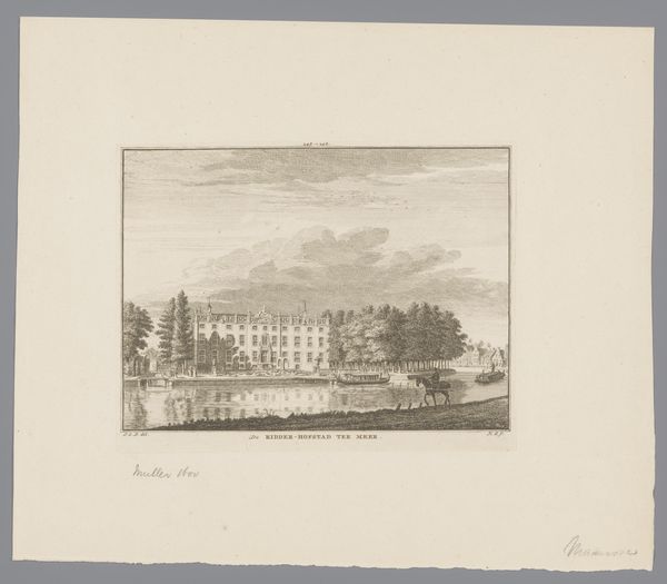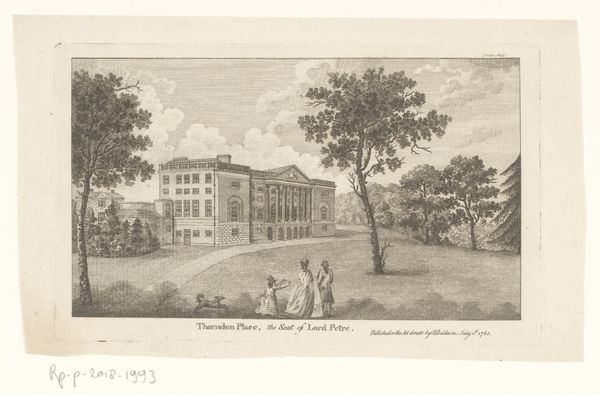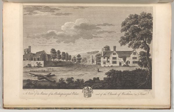 Curator: Oh, look at this one! It feels like stepping into a Jane Austen novel, all gentility and whispered secrets among the trees. Editor: Indeed. What strikes me is the rigorous formalism embedded within its seemingly simple design. This etching, part of "The History and Topographical Survey of the County of Kent," meticulously renders Cobham Hall, a feat achieved between 1777 and 1790 by John Bayly. Note the architectural precision and calculated symmetry. Curator: Symmetry's a bit of an understatement, isn't it? Almost feels too… planned. But I suppose that was the point. It gives this feeling of control and order. Is this neoclassical perhaps? Editor: Precisely. We can see echoes of neoclassical ideals – balance, restraint, and a harking back to classical antiquity are prominent. The even distribution of light, the unwavering perspective… Curator: ...Which almost makes it feel… distant, doesn't it? Like a stage set. And those towering trees, framing the scene…almost too perfect, too placed. Almost oppressive to think it lives within the pages of a book, like it’s archived instead of inhabited. Editor: That placement is indeed strategic, guiding the eye towards the focal point: the hall itself. The artist plays with the planar recession to deepen our view into the estate and assert architectural command. It is not simply an illustration, but an exercise in spatial manipulation, loaded with geometric intention. Curator: True. Even the way the light etches out the building...almost makes you think this is the most important thing happening, as if the people that are suggested to be inside it, the actual life of the space, isn't worth seeing. It's there for power. Funny that even this medium of book print makes it inaccessible. Editor: Absolutely. The book context elevates the image, as an informational object meant for the privileged few, thus embodying the very themes it represents: class and access to material comforts and knowledge. Its beauty and the precision, create not only something pleasing but something with embedded historic ideologies. Curator: Which is a nice reminder that even pretty pictures have stories bubbling beneath. It’s a formal portrait of an era, but the mood almost reveals an unconscious story as well, something caught in its symmetries. Editor: It’s a testament to art's multilayered language, indeed. Every choice speaks, every stroke reveals a cultural context worth uncovering, especially for an attentive eye.
