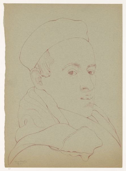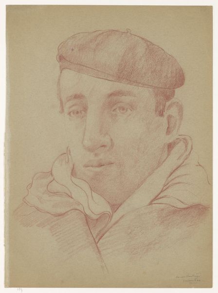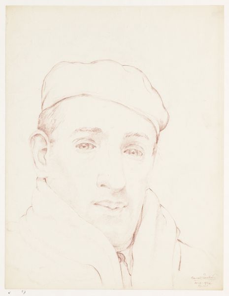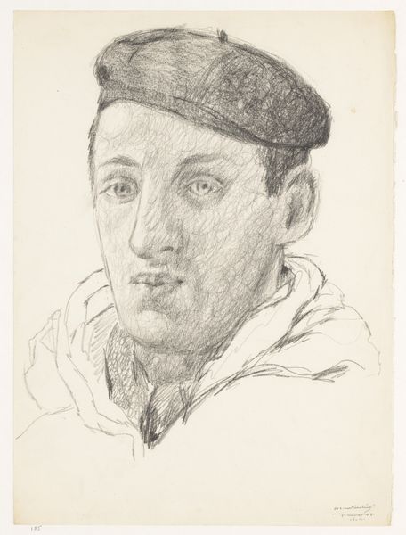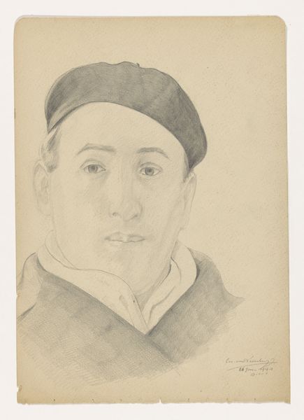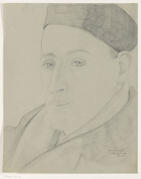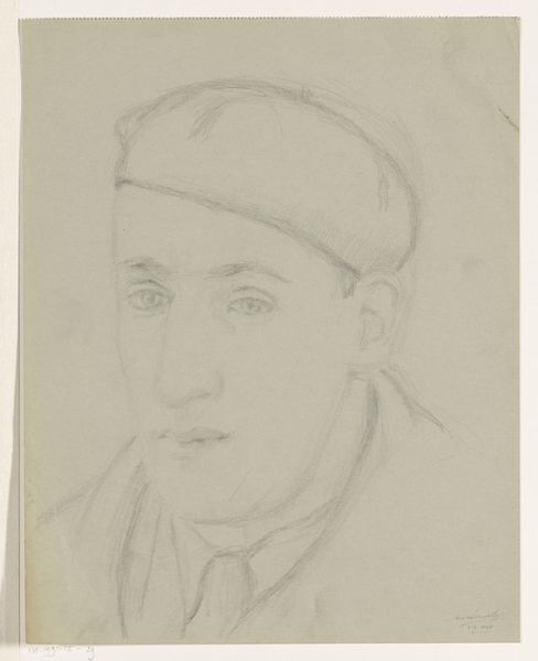 Editor: This is "Self-Portrait with Cap: B-1-1, 18 February" possibly from 1942, a pencil drawing by Cor van Teeseling, currently housed in the Rijksmuseum. It's strikingly stark, with the artist’s gaze feeling very direct. How do you interpret this work, especially considering the date? Curator: That direct gaze is compelling, isn’t it? Given the possible date of 1942, during the Nazi occupation of the Netherlands, this self-portrait takes on a particular resonance. Consider the act of self-representation during a time of intense surveillance and oppression. Do you think this portrait is a statement of identity, resistance, or something else entirely? Editor: I hadn't thought about it that way. Maybe it’s about maintaining a sense of self, even when external forces are trying to erase you? Curator: Precisely! The simplicity of the pencil drawing, the directness of the gaze, these could be seen as acts of defiance against the dehumanization inherent in fascist ideologies. It becomes crucial to see how identity and selfhood are represented, especially within oppressive structures. Does that change how you perceive the artwork now? Editor: Definitely. I was initially drawn to the formal elements, but understanding the socio-historical context adds a whole new layer of meaning. Curator: Indeed. By engaging with historical and social context, we begin to see how even the simplest of portraits can become powerful statements of resistance. Editor: That’s amazing, it’s made me look at the portrait in an entirely new light. Curator: Exactly. It is about acknowledging not only individual artistry but also its wider function, political and philosophical meanings that reverberate far beyond the gallery.