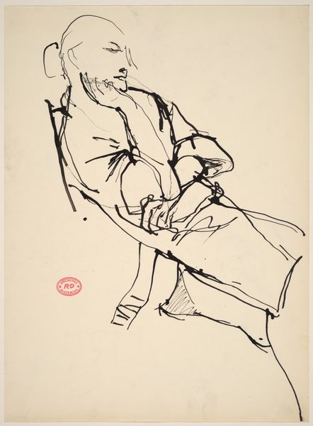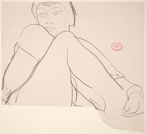 Curator: The sparseness is striking; almost melancholic, don't you think? Editor: It's a study in vulnerability. Here, we see Richard Diebenkorn's ink drawing, dating between 1955 and 1967. It's titled simply, "Untitled [female nude in stockings seated on draped stool]." A title, interestingly enough, that’s descriptive, almost detached. Curator: True, but it's that very sparseness that communicates so much. The visible tension in the figure, conveyed through the suggestive power of ink, evokes introspection, and perhaps a hint of sadness. The stockinged legs offer an interesting study in fetish and restraint. Editor: It raises interesting questions about the male gaze and the representation of women, certainly. But this was also the period of Diebenkorn’s transition away from pure abstraction towards figuration, a fascinating shift in artistic focus. Curator: The visible under-drawing reveals his artistic process; erasures suggesting how he wrestled with both form and its psychological implications. The figure feels raw and immediate. Is she simply a body, or a cipher? Editor: What’s compelling here is how it engages with broader post-war anxieties, as Diebenkorn moved away from the dominance of Abstract Expressionism. A time of changing social norms, political anxieties and artistic freedom, each mark reflects the moment and shifts within the cultural psyche. Curator: Even that red, almost bureaucratic stamp feels loaded. Like a mark of ownership or inspection... almost violent in its assessment. It gives you an uncomfortable pause. Editor: The stamp, likely a studio mark, reminds us of the institutional forces framing art, its reception, and its commodification within gallery spaces. Even in its supposed incompleteness, we read and impose meanings based on socio-cultural narratives. Curator: In its minimalist approach, Diebenkorn challenges us to question what meaning is imbued by the image. Editor: Or, to question how external structures determine what art *means* to a viewing public. In just a few lines, this work spurs us to probe our history, our biases, and our gaze.