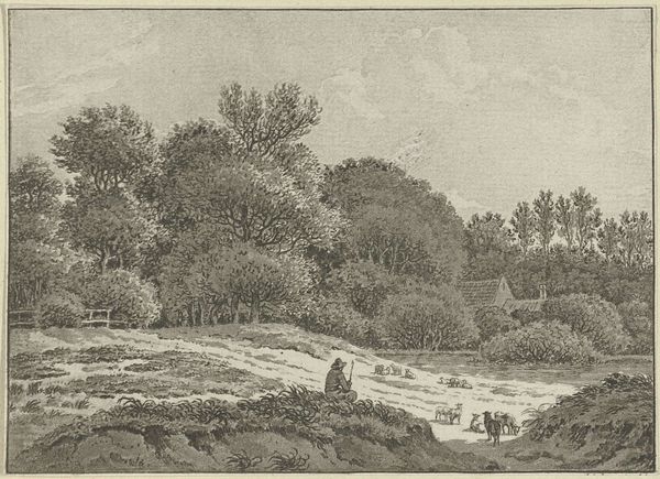 Editor: This is "Landschap bij Overveen," a pencil drawing by Jan Evert Grave, dating sometime between 1769 and 1805. The scene feels so peaceful and removed. How do you interpret this work, especially given its historical context? Curator: This drawing provides us a window into the changing relationship between humans and the environment. Notice how the landscape isn't simply background; it’s foregrounded. What was Grave suggesting about humanity's place within that landscape at this historical moment? How does it intersect with nascent ideas about romanticism and our idealization of nature versus the political and social realities for everyday citizens? Editor: So, it's not just about pretty scenery then? More about the socio-political dynamics within the community it depicts? Curator: Exactly. Think about land ownership and access to resources in the Netherlands at this time. This idealized pastoral scene might mask deeper inequalities. Does this image serve to naturalize certain hierarchies, obscuring the struggles of those who may not have enjoyed such idyllic leisure? Editor: That’s fascinating. It makes me question my initial, somewhat naive, interpretation. It’s not just a simple landscape but a potentially loaded depiction of society and power. Curator: Precisely. And by understanding those power dynamics, we can develop a richer understanding of Dutch history as represented through its art. What new questions arise for you when you think of it this way? Editor: Now, I'm curious about who *owned* this land, who worked it, and how those unseen figures are represented or erased by the visual framing. Curator: Excellent questions. This shows how art serves not only as a reflection but also a site of ongoing negotiation and revelation.