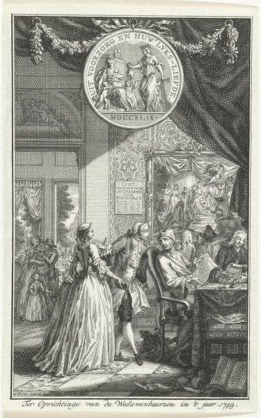 Editor: This is Augustin de Saint-Aubin's "Sancho's dinner at the Island of Barataria." It's quite small, an engraving really, but it depicts a lavish scene. What do you see in this piece? Curator: I see a fascinating representation of power dynamics. This engraving, made through a repeatable process, makes a statement about labor and consumption in 18th-century society. How does the act of reproducing this image affect its value and accessibility, relative to the scene it depicts? Editor: That's an interesting way to look at it; I hadn't considered the means of production itself as a commentary. Curator: Exactly! It prompts us to consider the cultural context that led to its creation. Editor: I'll definitely keep that in mind going forward.