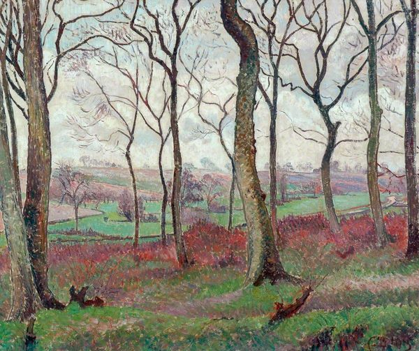 Editor: Here we have Camille Pissarro's "The Pond at Montfoucault, Effect of Winter," painted in 1874 using oil on canvas. There's a quiet stillness to it; the colors are muted and cool. How do you interpret this work within the context of its time? Curator: Pissarro, aligned with the Impressionists, actively challenged the academic art establishment. Consider the "Salon" system – the official exhibitions controlled by the Académie des Beaux-Arts. Impressionists like Pissarro were frequently rejected. What do you notice about the brushstrokes? Editor: They're quite loose, broken, not blended smoothly like you'd see in academic painting. It’s almost like capturing a fleeting moment. Curator: Exactly. This "unfinished" quality was a direct rebellion against the polished, idealized landscapes favored by the establishment. Painting *en plein air*, or outdoors, as they often did, prioritized capturing the immediate sensory experience. The location too - a seemingly unremarkable rural scene – democratizes art's subject matter. Why paint a pond when you could paint a heroic battle scene? Editor: So, by choosing everyday subjects and painting in a radically different style, Pissarro and the Impressionists were making a statement? Curator: Precisely. They were asserting a new vision of art, one rooted in individual perception and modern experience, challenging traditional power structures within the art world. Consider, too, the rise of industrialization during this period – were the Impressionists perhaps looking for an escape in these landscapes, a retreat from the rapidly changing urban environment? Editor: That’s a perspective I hadn’t fully considered. Seeing it as a response to social and industrial changes adds another layer of meaning. Curator: The politics of imagery, eh? Sometimes it's more than meets the eye. Editor: Absolutely. I'll definitely look at Impressionism with fresh eyes now. Thank you!