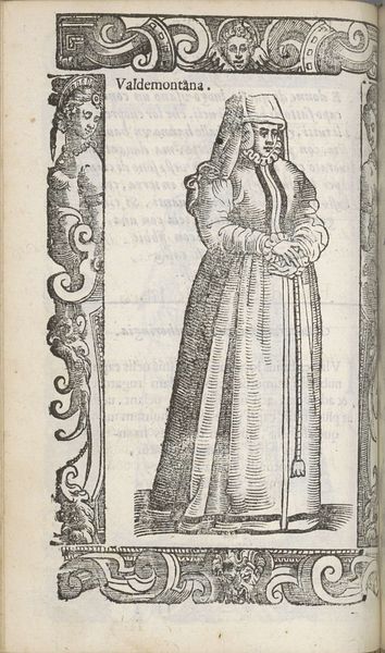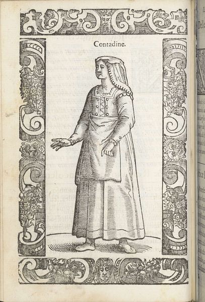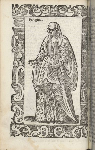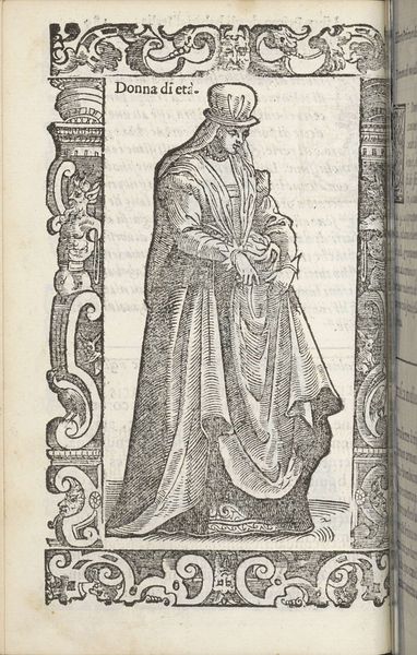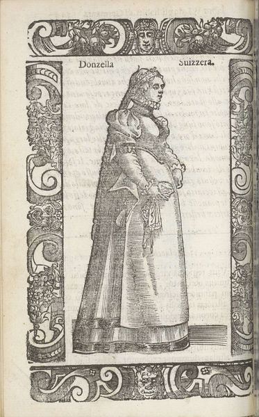 Curator: The precise linework here is truly striking. We're looking at "Nobile ornata", a drawing by Christoph Krieger from 1598, executed with pen and ink on paper. The condition of the paper lends a certain aged aura to the overall piece, and what jumps out most for you? Editor: The detail! But first impression? Regal, but almost like a sketch captured between royal duties. There's a contrast between the figure's composed posture and the apparent immediacy of the pen work that makes me want to inspect closer the labor and artistic intention behind such detailed artwork on seemingly delicate paper from that era. Curator: Absolutely, that tension is palpable. I’m immediately drawn to the level of ornate decoration—it’s fascinating to consider the socio-political meaning behind this portrait of a noblewoman and the status these elaborate garments project, particularly given the rising fashion trends within court society. We need to examine the networks of artisans and craftspeople required to bring such fashions and portraiture to life. Editor: And look at how the dress is ornamented with these stars and quatrefoils! What of this kind of early celebrity endorsement from a visual production and consumption standpoint? To be captured like this must have required specific modes of patronage, not simply existing workshops, what about the status of paper and ink at the time, considering access to production, the cost, and who commissioned the piece and controlled the narrative, not just for themselves, but for larger socio-cultural structures in the artistic community during Krieger’s artistic activity in Nuremberg? Curator: Indeed. Consider how this image functions. The very act of memorializing the noblewoman within a personal sketchbook provides insight on how such a drawing, likely part of larger artistic networks, might then translate into prints that would later reach a much wider, often international audience via workshops that depended on commissions. The artwork gives access to how gendered and social values shaped the world she navigated. Editor: And even that border seems crucial - the decorative frame almost merges into the printed page beside, pointing toward where this existed within the book’s means of production. As a means for understanding Renaissance portraiture within and as its broader function and circulation in art distribution. Curator: Precisely. Thank you for offering a more nuanced reading! Editor: A pleasure, contextualizing its social and cultural value in print shifts our engagement, doesn't it?