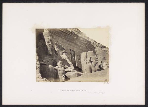 Maxime Du Camp made this photograph, 'Entrée du Spéos d'Athor, à Abousembil', using the calotype process, one of the earliest photographic techniques. Calotype uses paper coated with silver iodide, exposed in a camera, and then developed to create a negative image. What is remarkable is the way Du Camp's approach reveals the monumentality of the temple entrance. The soft, fibrous nature of the paper negative lends a texture to the image, emphasizing the rough-hewn quality of the stone facade. We see the huge statues flanking the entrance, each carved directly from the rock face. The process itself – the careful coating of the paper, the exposure, and the development – mirrors the slow, deliberate carving of the temple. Consider too, the labor required for both the original carving and for Du Camp’s expedition. Photography in the 19th century was not merely a matter of pointing and shooting; it involved laborious preparation and complex chemistry, often undertaken with the help of many hands. Du Camp's work bridges ancient craftsmanship and modern modes of production.