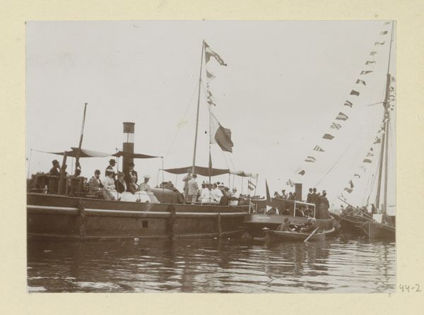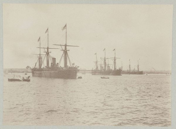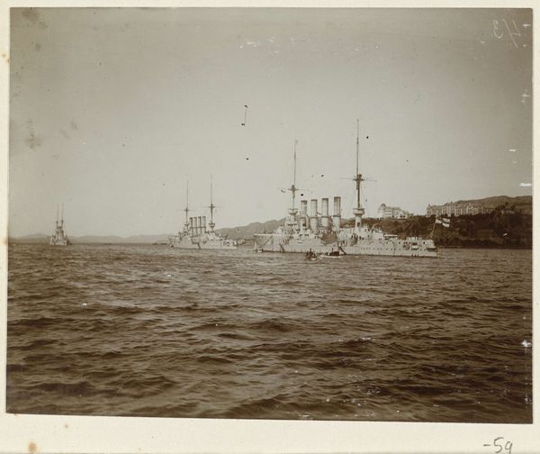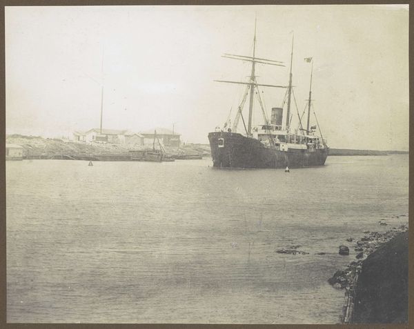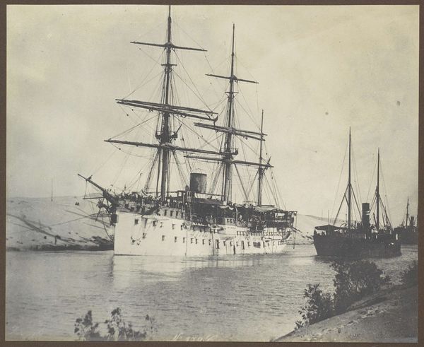 Curator: This photograph, "Schip passeert een vuurtoren, vermoedelijk bij het Suezkanaal," which translates to “Ship Passing a Lighthouse, Probably at the Suez Canal”, was taken between 1880 and 1900 by C. & G. Zangaki. Editor: The mood it evokes is quite somber. The monochrome palette lends it a sense of historical distance, and the stark contrast between the imposing ship and the slender lighthouse sparks curiosity. It certainly captures the loneliness of both structures as well as the grand and global nature of the sea, trade, and the early era of modern technology, such as shipping. Curator: Exactly! What we see here goes beyond a simple seascape. The image subtly encapsulates the story of 19th-century colonialism and the surge in global trade catalyzed by infrastructures like the Suez Canal. The lighthouse, a beacon of progress, stands in contrast to the vessel, signifying imperial might navigating through newly opened routes. The photograph also serves as a potent example of Orientalist photography prevalent during that period. Editor: Interesting point! How do you view this imagery as a reflection of power dynamics? Does it emphasize the vulnerability or the strength of the people connected with that region? Curator: I perceive an implicit sense of dominion. The composition, in its capturing of human ingenuity conquering geographical constraints, seemingly showcases the domination of trade routes over colonized countries. Though ostensibly documenting modernization, its very existence reveals a Eurocentric viewpoint shaping perceptions about the East. It further brings attention to the unacknowledged laborers, particularly those from colonized lands, who bore the grunt work involved in such constructions as the Suez Canal. Editor: That's a deeply resonant and poignant observation, shedding light on layers beyond what one sees initially. The political dimensions you are pointing to speak volumes about its legacy. Curator: It does underscore the vital dialogue to have around representation, especially regarding works from this epoch. Editor: Certainly. Thank you, these perspectives have offered new context for observing these past constructions in light of our modern ethical engagements.