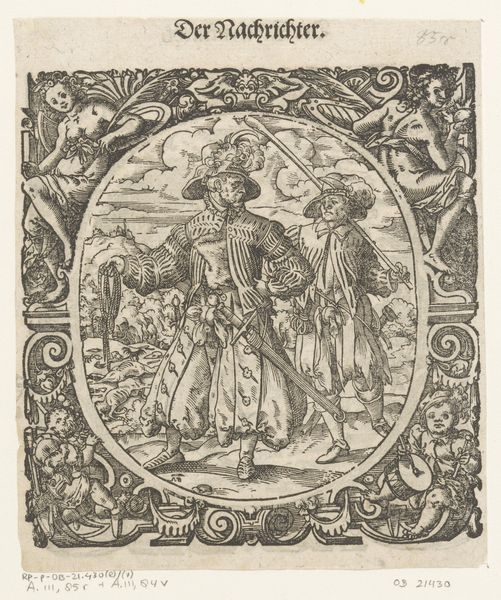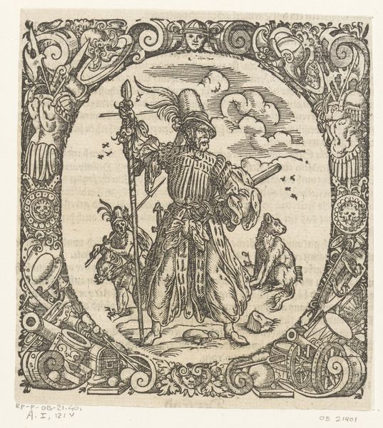 "Landsknecht en musketier" by Jost Amman, is an engraving made in the 16th century. The circular composition immediately draws the eye, framing two figures in a tight visual space. The Landsknecht and musketeer are rendered with precise lines, emphasizing the textures of their garments and armor. Amman’s choice to encircle these figures with an ornate, decorative border introduces a duality between the central subjects and their context. This contrast could be interpreted through a semiotic lens: the warriors represent the emerging military strategies of the Renaissance, while the classical motifs in the border symbolize the enduring influence of the past. The circular frame may also function as a visual metaphor for containment, hinting at the constraints and order imposed on these figures despite their roles as agents of change. This engraving, therefore, presents a structured commentary on the evolving roles of the military, mediated by the visual structures that Amman employs. The artwork invites us to explore the interplay between tradition and innovation during a transformative period in European history.