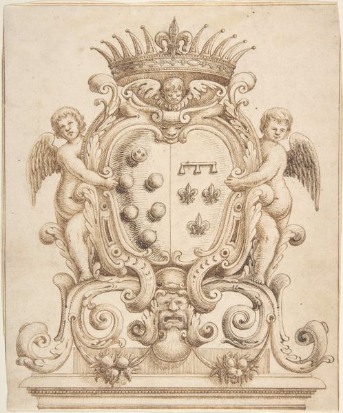 Editor: This is an ink and pen drawing called "Candelabra Grotesque on a Pedestal with Fantastical Creatures and a Lobster" dating from 1540 to 1570, currently housed at the Met. It reminds me of an elaborate architectural sketch…but for something that could never exist. What do you make of all these bizarre creatures, these ‘grotesques’? Curator: It’s fascinating, isn't it? The grotesque, as a visual mode, gained prominence during the Renaissance, emerging from the rediscovery of ancient Roman decorations. But I wonder, what is the social function of the grotesque? Does it serve simply as ornamentation or something more? Editor: More than just ornamentation? Curator: Think about it. The Renaissance was also a period of intense social and religious upheaval. The grotesque allowed artists to explore anxieties, challenge established norms, and critique power structures – to invert expectations. How might these seemingly playful figures also hint at the instability and contradictions within Renaissance society? Editor: So these bizarre hybrids – the lobster, the winged figures – they're not just flights of fancy? They’re ways of representing societal tensions? Curator: Precisely. The juxtaposition of human and animal forms, for example, can be read as a commentary on humanity’s relationship to the natural world, but also its base instincts, or to highlight marginalized groups of society. This work really encapsulates how Renaissance artists used "play" to discuss real-world concepts such as anxiety and challenge expectations and cultural norms. What do you think the artist is challenging or exploring in this particular piece? Editor: I guess I hadn't considered that grotesque could be so political! I just saw the “playfulness” and ornamental qualities. Curator: Well, precisely! Art always has layers!
