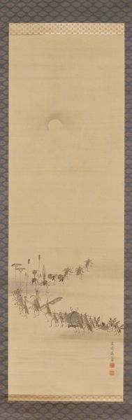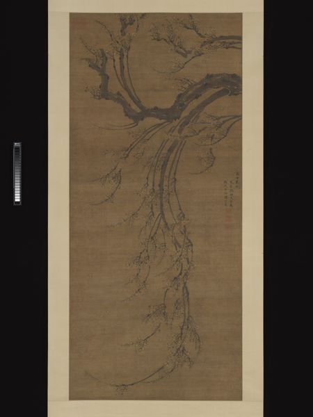 Editor: Ma Lin’s hanging scroll, “Visiting a Recluse with a Qin,” created around the 13th century with ink on silk, really struck me with its serene and almost dreamlike atmosphere, despite the rather somber palette. What catches your eye when you look at it? Curator: I’m immediately drawn to the dynamic interplay between void and form. The composition’s success resides less in its representational accuracy and more in how the artist organizes shapes, lines, and tonal variations across the picture plane to establish visual equilibrium. Notice how the dominating, gnarled pine tree on the right is counterbalanced by the empty space to its left, only to be interrupted lower by smaller trees. Editor: So you're saying that it's less about the story it might be telling and more about the relationship between the different elements? Curator: Precisely. Observe the application of ink wash. Where does it thin and fade? Where does it pool and darken? Note the calligraphic quality of the brushstrokes that articulate the branches, juxtaposed with the more diffuse treatment of the distant mountains. These formal contrasts give vitality to what could easily become a static composition. It pushes beyond the traditions of landscape paintings, prioritizing its structure. Editor: I see what you mean. It’s almost like a dance of dark and light, solid and empty. Looking at it that way, the content takes a back seat to the overall design. Curator: Precisely, and in appreciating the design we find new pathways into understanding not only what it is to see, but also, what composes "Seeing." Editor: I never would have thought to approach it that way, focusing so much on the formal elements rather than the narrative. I’ve definitely gained a new perspective! Curator: As have I. Analyzing visual language of “Visiting a Recluse with a Qin” underlines the powerful relationships embedded within its composition.