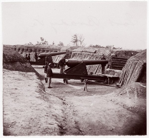 This photograph by Andrew Joseph Russell shows cannons in a defensive position, likely taken during or shortly after the American Civil War. The cannons themselves are products of heavy industry; cast iron or steel, precisely machined and assembled. Consider the vast amounts of labor and resources required to produce not only these weapons, but also the earthworks that surround them. The very materials speak to the industrialization of warfare. Cannons like these required specialized knowledge and manufacturing capabilities, representing a shift from earlier, more craft-based approaches to military technology. Also notice the landscape itself - reshaped and fortified. These cannons were instruments of immense destructive power, and their placement here reflects a society deeply engaged in conflict. Russell's photograph is a reminder that even seemingly straightforward images can reveal complex social and technological histories. It challenges us to think about the relationship between materials, making, and the wider context of human experience.