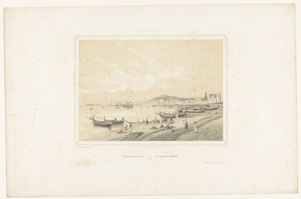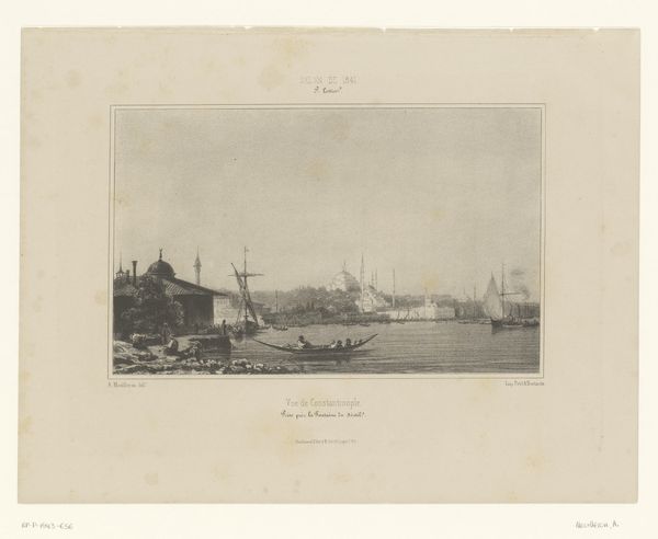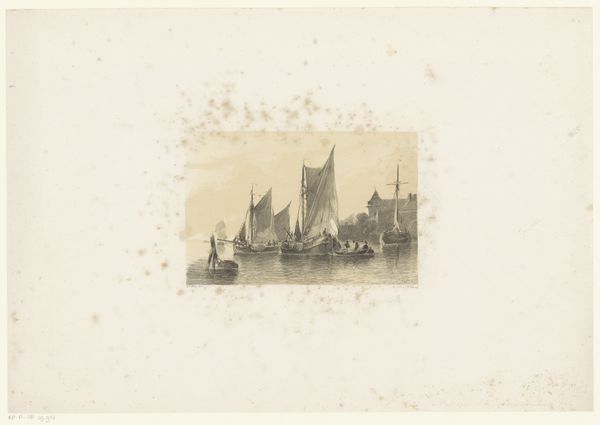 Ferdinand Victor Perrot rendered this detailed print, "Ship Anchored near the Westminster Bridge," using clear, precise lines to create a sense of depth and atmosphere. The composition centres on a sturdy vessel, depicted with meticulous attention to its structure. The ship is horizontally aligned to the page, and anchored slightly off-centre, creating a visual imbalance that subtly animates the scene. The artist balances the industrial architecture of the bridge, with the naturalistic representation of the water, blurring into the hazy sky. The restrained palette focuses on muted greys and blacks, and heightens the atmospheric quality of the scene. This choice underscores the industrial nature of the setting and creates a somber tone. The dense concentration of lines forms a visually compelling interpretation, capturing the essence of 19th-century London.