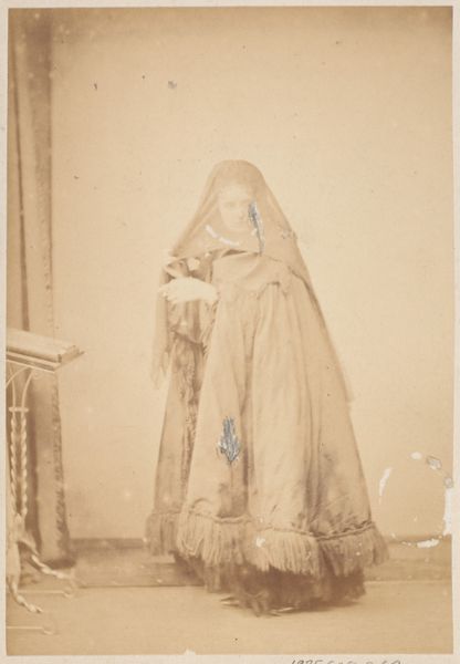 Curator: This photograph, likely taken between 1887 and 1900 by G. Lekegian & Co., is titled "Portrait of an Unknown Veiled Turkish Woman." Editor: The immediate impression is one of guarded beauty. The composition draws the eye to her gaze, the only exposed part of her face, softened by the delicate fabric. Curator: Indeed, the work exemplifies Orientalist tropes prevalent during that era, feeding into Western fascination with and often misrepresentation of Eastern cultures. What appears exotic also raises questions about agency and representation. Who was she, and what role did she play in its creation? Editor: Technically, the limited tonal range is compelling. The play of light on the different layers of fabric, the subtle gradations in the background—they almost lend a painterly quality to the photograph. Curator: But that light, carefully orchestrated, also highlights the limitations placed upon her. The veil, while perhaps culturally significant, visually speaks to restriction and anonymity. How complicit was she in constructing that image? Was this taken for a Western audience? Editor: I concede that context, but I see the subject's composed gaze as piercing. The composition itself is strong: the contrasting textures—the smooth veil against the ornamented rings—create a striking visual dynamic. Curator: True, yet these carefully chosen adornments perhaps tell us about the sitter’s class, or lack thereof; further contextual inquiry into photography during the turn of the century might yield insights. Did the studio dictate the entire look and feel? Were similar photographic practices enforced in other parts of the world? Editor: A useful point. Nevertheless, beyond the socio-historical reading, the artist achieved formal harmonies here. The photographer clearly was trying to imbue this “anonymous” portrait with qualities meant to elevate it. Curator: It reminds us that historical images, however beautiful or well-composed, need critical analysis regarding identity, cultural exchange, and often, colonial power dynamics. Editor: And sometimes it’s good to just stand back and marvel at the way a photographer was able to turn a captured moment into something undeniably exquisite.