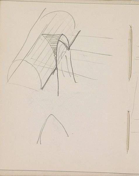 Curator: This pencil drawing, entitled "Gewelfsysteem," or "Vault System," comes to us from circa 1916. It is currently held in the collection of the Rijksmuseum. What's your initial take on it? Editor: It strikes me as very provisional, almost dreamlike. Those faint lines and shifting perspectives suggest the artist is more interested in the possibility of form than its fixed reality. Curator: Precisely. Notice how the artist uses only the barest lines to define these architectural forms. There's a definite emphasis on the abstract articulation of space through the relationships between line, plane, and void. The linearity almost transcends its representational purpose. Editor: Yes, the skeletal quality evokes something primal about shelter and structure. Arches are inherently symbolic – think of triumph, doorways to new realms. But here, rendered so ethereally, they become fragile, almost questioning that symbolism. One can see the same symbolic features in many ancient buildings like gothic cathedrals. Curator: I agree. The repetitive arch form allows the artist to rigorously investigate spatial construction using purely formal means, a study in seriality long before that became a watchword. The incomplete nature invites one to visually "complete" the geometry within their mind, to envision all the components fully developed in space. Editor: Right, the imperfection almost compels us to engage actively with the artist's vision. In some ways it speaks to how humans eternally construct meaning, ever incomplete and open to interpretation, but the geometric structure brings to mind both earthly concerns but equally echoes the infinite expanse. Curator: It’s that very incompleteness, I believe, that best exemplifies the artwork’s ethos. We see the genesis of an idea, an unfolding, rather than a finished statement. The image lacks symmetry, the geometry wanders to the side, yet one could still infer meaning to an informed viewer. Editor: Exactly. It is as much about process as product. A tentative gesture toward understanding both our built world and our interior landscape. A very fleeting moment of contemplation. Curator: I leave with a renewed respect for simple, suggestive marks. How few precise pencil strokes may hold such spatial depth and potential.