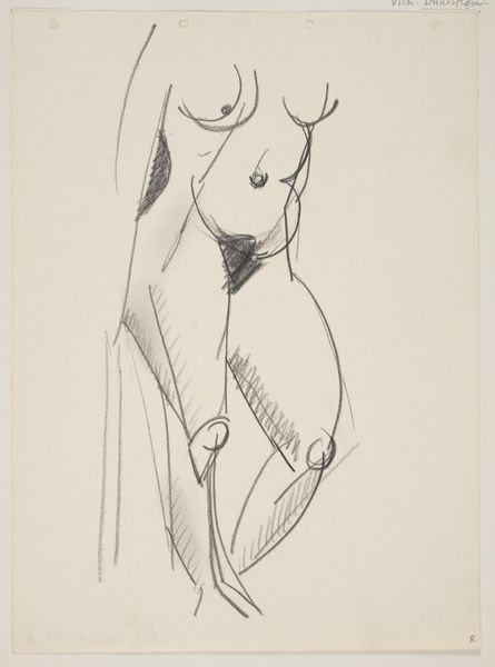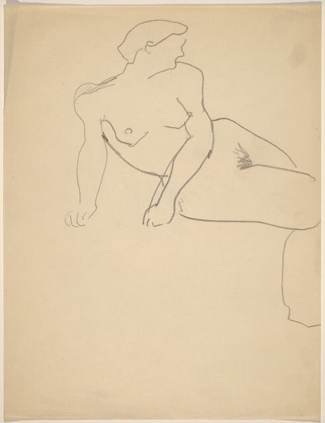Curator: Here we have Gaston Lachaise’s pencil sketch, "Female Nude," currently residing at the Harvard Art Museums. Editor: There's a disarming simplicity to it. Like a memory barely sketched out on paper. Vulnerable, you know? Curator: Lachaise was known for his monumental sculptures of the female form. This seems to be a study, maybe, capturing an essence more than a likeness. It's interesting how he suggests volume with so few lines. Editor: Volume, yes, but also this groundedness. She feels solid, real, even in her incompleteness. It's that weight, that presence, that gives her power. Curator: Exactly. It subverts the traditional objectification of the nude by emphasizing her agency, her physicality as a source of strength, rather than mere beauty. Editor: I feel like there is so much left unsaid, almost daring the viewer to fill in the blanks with their own story of strength and resilience. Curator: A delicate but powerful piece, prompting thoughts on representation and the female form in art. Editor: Indeed, more than just a nude, it feels like an echo of stories untold.