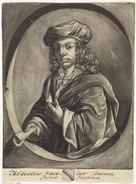 Curator: This plate by Wallerant Vaillant depicts Caspar Netscher, the celebrated painter. There's a quiet confidence radiating from him. Editor: Yes, and look at the sheen on that fabric! The printing process must have been demanding to capture it so realistically. Curator: Absolutely, the luminosity elevates Netscher to an almost archetypal representation of the artist. Palette and brushes in hand, he embodies creativity itself. Editor: But it’s also a carefully constructed image of status. The clothing, the pose – it’s all about presenting artistry as a respectable profession, a kind of brand identity. Curator: Perhaps, but I see a deeper aspiration. He gazes out, inviting us to understand the soul behind the art, its endless search. Editor: Maybe... but also, this print was a commodity, destined for circulation, shaping and selling an idea of the artist to a wider public. Curator: You bring a grounding perspective. It seems we both see reflections here, though through different lenses. Editor: Indeed. A print like this provides a fascinating window into understanding artistry as labor and the construction of artistic fame.