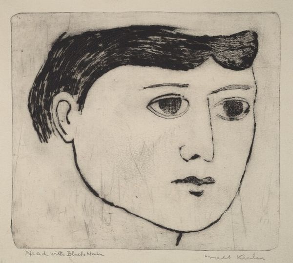 Editor: Here we have Julie de Graag's "Portret van een onbekende jongen," or "Portrait of an Unknown Boy," created sometime between 1887 and 1924. It’s a pencil drawing and there's something almost haunting about his expression. What stands out to you when you look at it? Curator: Well, consider the *labor* involved in a piece like this. De Graag is meticulously rendering a subject using readily available materials: pencil and paper. It wasn't a high-cost endeavor necessarily, yet look at the skill required to create this level of detail. Editor: Right, I can see that. But what about the "unknown boy?" The anonymity makes me wonder. Curator: Precisely! His anonymity makes the viewer consider the social context. Who *was* this boy? Was he a street urchin? A son of a wealthy patron? De Graag's decision to present him without clear markers of class invites scrutiny of societal structures of the era. Also, do you notice the sharp contrast with the almost crude pencil texture behind him? Editor: Now that you mention it, that rough texture around the subject is more interesting than it first seemed. How might the paper used influence its interpretation? Curator: Excellent question! The grade of paper used affects the graphite's receptiveness and determines the depth of texture which brings to the discussion not only aesthetic concerns, but also questions around cost and access to better drawing materials which also highlights inequalities inherent in artistic production during that period. The black ink applied over the paper background has cracks that exposes the bare materiality of its making! It's powerful stuff, don't you think? Editor: I do. It's amazing how simply examining the materials and their context can unlock so much meaning. Thank you for showing me how to look beneath the surface! Curator: My pleasure! Remembering art as an act of labor and a product of its environment allows us to critically engage with its power and significance.