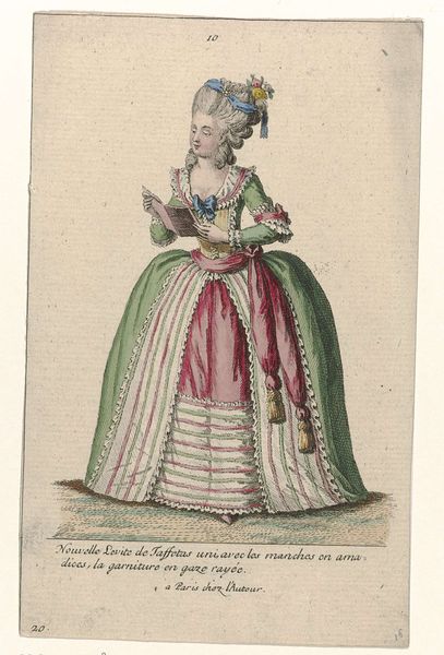 Curator: This lovely drawing is titled "Magasin des Modes Nouvelles Fran\u00e7aises et Anglaises, kopie naar 1787, Pl. 1, 8e cahier," and dates to 1787. The artist listed is J.J. Tuttot. Editor: Oh, the pastels! It's like a sugared almond became a whole outfit. And that enormous headpiece, like a ship in full sail…slightly intimidating but undeniably charming. Curator: Absolutely! These fashion plates were not mere illustrations. Consider the intense labour represented, from weaving textiles to intricate lacework; how dressmaking supported a burgeoning industry of largely female labourers. The social meaning—these garments defined class. Editor: It’s interesting to consider the politics woven—literally!—into the very fabric of the day. I find this figure embodies a very rococo sense of playful absurdity. Almost like she doesn’t quite believe in her own grandeur. Curator: Precisely! The medium is watercolor, offering delicacy that tempers that inherent status signifier you noticed. The washes imbue the textures with an approachable softness. But the original plate was a product to sell: note how the title explicitly lists two regions – France and England – subtly hinting that there’s choice, maybe competition, in acquiring *this* look. Editor: Right, so while visually ethereal, its practical context lies in mercantile pursuit. The hand resting jauntily on her hip even reads as a pose designed to show off design details more than regal poise. This single sheet reveals such layers of fabrication – the fabric itself, and also this early method for mass distributing 'the look'. It hints at fashion’s early reach as a driver in consumer society. Curator: Yes, we forget that early examples of fashion were so deeply connected with artistry and industry in that way. But consider how watercolours such as these circulated tastes; perhaps creating and distributing aspiration much earlier than many of us imagine. Editor: From powdered wig to painted watercolour, these artifacts remind us: taste making always had material costs, dreams never quite escape tangible hands.