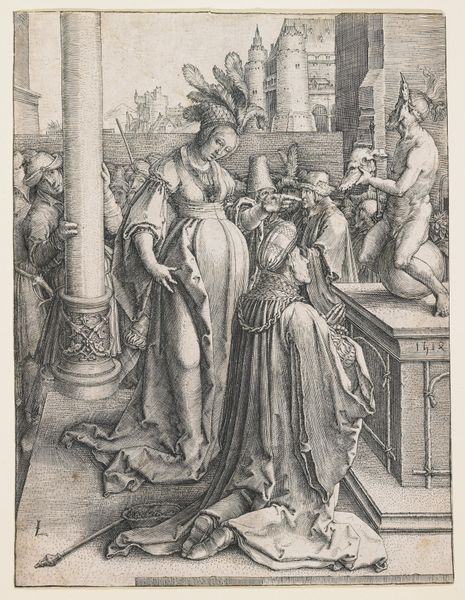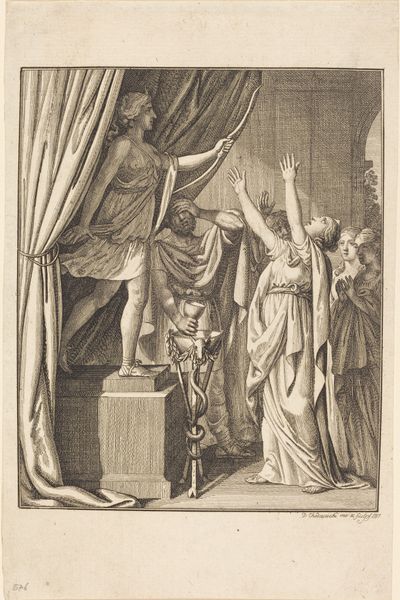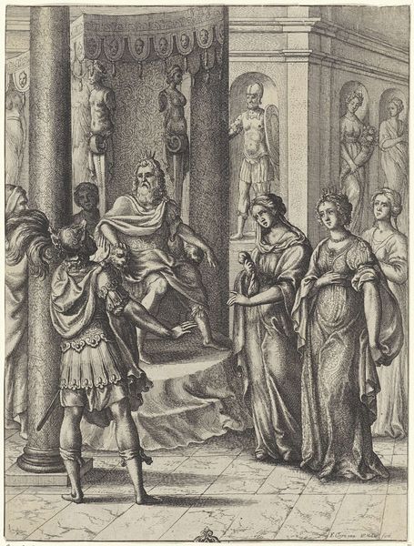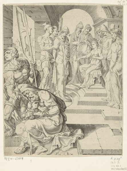 Editor: This engraving, "Salomo's Afgoderij," created in 1551 by Dirck Volckertsz Coornhert, seems to depict a moment of high drama. The figures are incredibly detailed with flowing lines, and it almost has a chaotic, swirling energy. What catches your eye in this piece? Curator: The linear precision is remarkable, isn't it? Note how Coornhert utilizes line weight to suggest depth and shadow, especially in the drapery. The composition is structured by strong vertical and horizontal lines – the steps, the figures themselves. What effect do you think the artist was aiming for by employing this structured framework, despite the busy scene? Editor: Perhaps it's meant to create a sense of order, a hierarchy? There is a queen at the center, raised up on stairs, seemingly more important. How else does this influence the mood? Curator: Precisely. Now observe how the figures’ gestures create diagonals that intersect these primary lines, adding tension and directing the viewer’s eye. Do you think that these intersecting diagonals serve any visual or structural purpose within the piece's formal properties? Editor: I hadn’t considered that, but I see it now! It creates a kind of visual push and pull, emphasizing certain areas and adding energy to the scene. I find the foreground intriguing with the discarded armor. What function might this collection of shapes play in relation to the queen standing higher? Curator: Exactly. These foreground elements create visual interest and guide the eye upwards towards the central figures. We can also consider the use of contrasting textures achieved through line variation to be quite important. Editor: Thank you, looking at it from a formalist point of view helped me to understand some visual clues I wasn't seeing. Curator: Indeed, by considering only the intrinsic elements within the piece, we gained a new perspective!