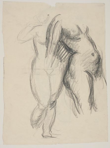 Editor: Here we have "Staggering Body Blows," a charcoal drawing by Francis Luis Mora. It’s…intense. There’s a real sense of struggle captured in the blurred lines and heavy shading. What can you tell me about this work? Curator: The raw physicality depicted here demands we consider its societal context. How might depictions of male combat be linked to the construction of masculinity and power during Mora’s time? The intensity you notice speaks to this performative aspect, the struggle embodying broader power dynamics. What elements of the composition emphasize this performative quality for you? Editor: Well, the way their bodies are contorted and pressed together, but especially how the man on top is looking out at the viewer. There’s something theatrical about it. Curator: Exactly. Consider how the sport, with its rules and rituals, becomes a stage upon which ideas of dominance, resilience, and even national pride are enacted. Also consider the homoerotic subtext implied through their violent embrace. How might we interpret this as either reinforcing or subverting conventional gender roles? Editor: I never thought about it that way, but seeing the direct gaze makes the viewer almost complicit in the action. It’s not just about physical prowess, but about the audience it plays to. Curator: Precisely. It is the viewer who determines who the victor may be, while others involved are inconsequential. The act is one-directional, emphasizing power over and on top of all things. Do you see the relevance of power as an inherent truth in "Staggering Body Blows?" Editor: It gives me a lot to think about regarding power structures and gender representation. I didn't think a boxing scene could offer so much beyond its immediate subject. Curator: These nuanced layers become visible when we use theory as a lens to understand art. Analyzing gender, class, and race gives us a much better overview of this "Staggering Body Blows".