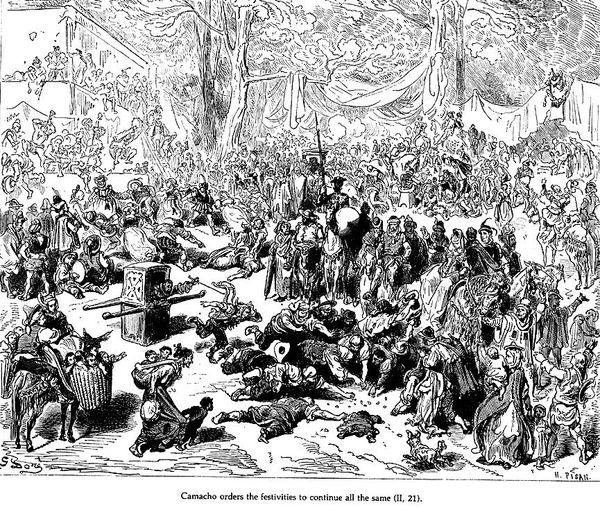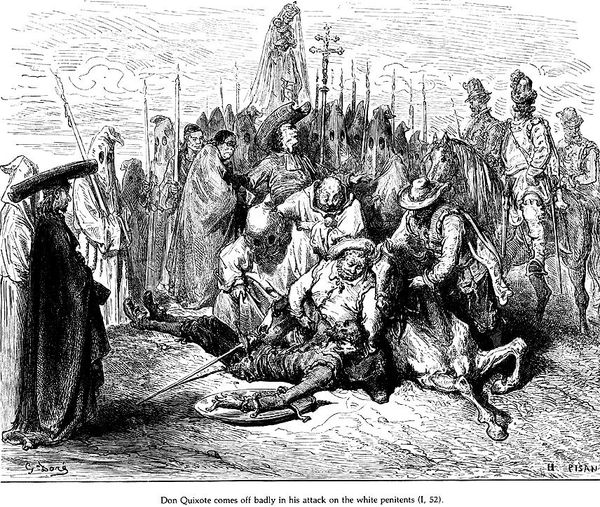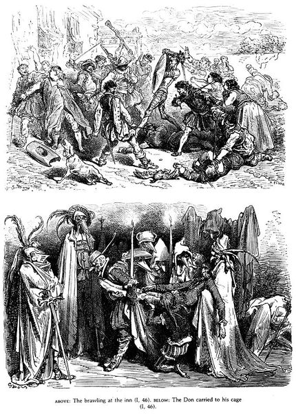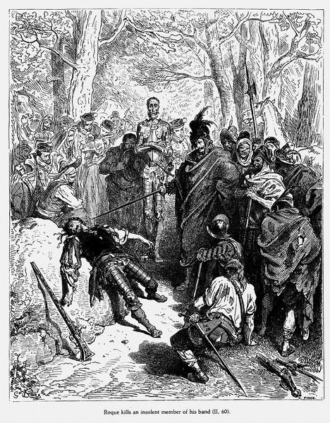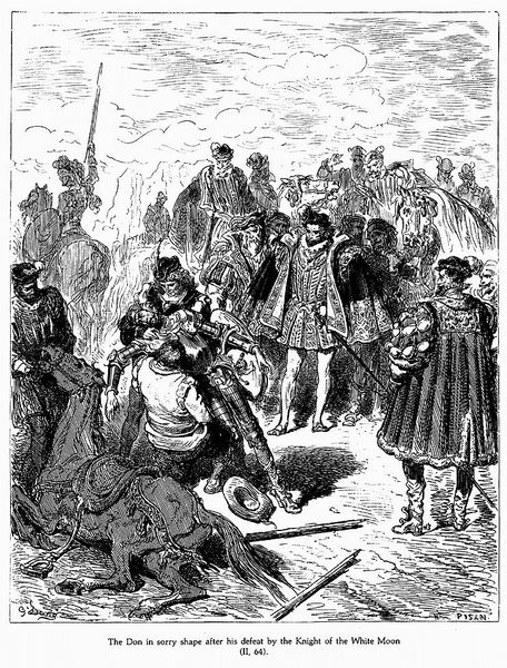 Gustave Doré created this image of Don Quixote using wood engraving techniques to illustrate Miguel de Cervantes's novel. Doré positions us amidst a jeering crowd as Don Quixote is beaten, capturing a moment of public humiliation. Consider this image in the context of 19th-century Europe, where class divisions were stark and societal norms were strictly enforced. Doré's Quixote is not just a figure of ridicule; he embodies the struggle against conformity. The novel has been read as a commentary on the clash between idealism and reality, and here we witness a painful collision. Doré’s detailed rendering invites us to reflect on our own values and the price of holding onto them in the face of societal pressure. What does it mean to be an outsider? How do we negotiate the tension between our dreams and the expectations of the world around us?
