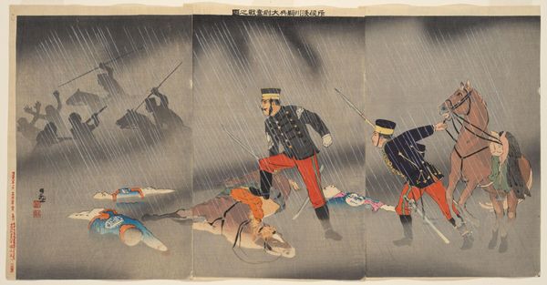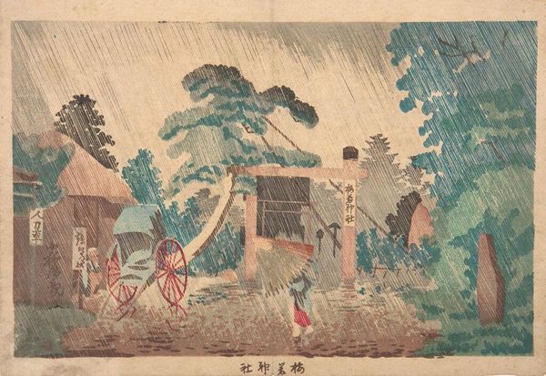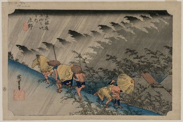 Curator: This woodblock print is titled "Suhara, from the series Sixty-Nine Stations of the Kisokaido" and it comes to us from Utagawa Hiroshige around 1835 or 1836. What’s your first impression of this work? Editor: It's the rain, isn't it? It's coming down so hard, blurring everything. There's a sense of urgency as travelers scramble for shelter; a temporary refuge on a well-traveled road. It gives me a deep feeling of isolation and also an acknowledgement of a common experience in shared plight. Curator: That’s a fantastic reading. Hiroshige uses these strong, almost brutal vertical lines to depict a torrential downpour. In Japanese art and culture, rain isn't just water falling from the sky; it's cleansing, renewal, and a powerful emotional force. Editor: And the figures are compelling. We have those on the left side bravely pressing on despite the weather. And then to the right the people who’ve made it to some form of respite. There’s such disparity and also community. I see how shelters like this became not just places of physical rest but of social exchange and temporary egalitarianism in their time. Did the social stratification of the time become paused by a powerful rain like this? Curator: It’s an intriguing question. Hiroshige doesn't offer us clear portraits. Faces are hidden, blurred by the rain, turned away. These figures become universal. The thatched hats symbolize a shared journey, shared vulnerability, even a shared anonymity against the elements and systems of the state. Editor: Yet, each seems weighed down differently. Some hurry towards a dry space, perhaps a break from societal and also economic burden, while the forms continuing into the rainfall are weighed by unknown forces, either their economic necessity to arrive at an intended point, or maybe their social obligation. Do you feel this sense? Curator: I do, it's compelling. The hurried, slightly frantic movement contrasts with the still, almost dreamlike quality of the downpour itself. It mirrors the eternal tension between humans battling against nature and attempting to find harmony with it. Even in the heaviest storms there are shared realities, shared burden, shared destinations. It really encapsulates the essence of the journey, doesn't it? The destination is just half the experience, and how lovely is Hiroshige here making a part of the story that is just weather. Editor: Yes, even in our modern, digitized and individualized experience, our shared public crises continue. Thank you for showing me that the visual record of human activity never really escapes our history and becomes permanently a part of our current consciousness.