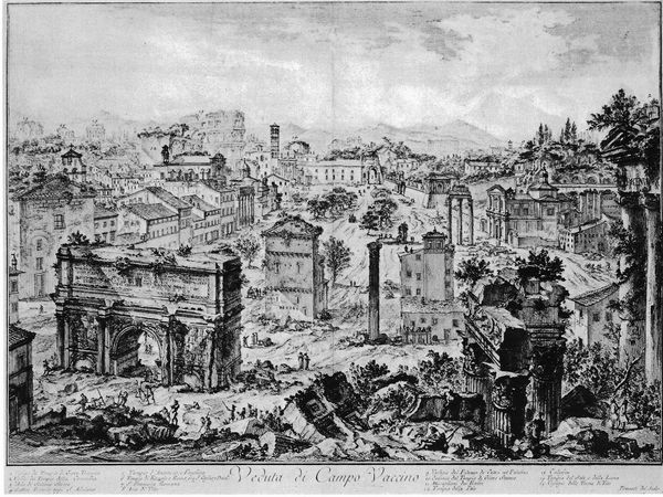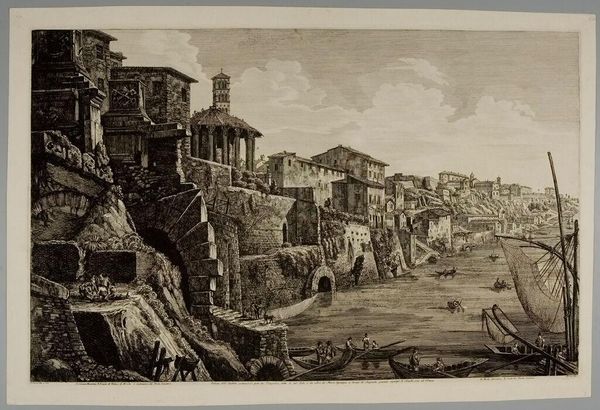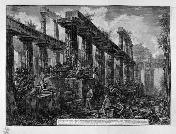 Curator: Look at the drama captured in this etching, "View of Campo Vaccino" by Giovanni Battista Piranesi. Editor: It’s incredibly detailed! There's something bleak about the subject matter: all these classical ruins, crumbling. You feel a real sense of decay, don't you? Curator: Precisely. Piranesi, of course, was fascinated with the grandeur of Rome, both present and past. But in this etching, note the meticulous process: the artist’s hand rendering every stone, every shadow, speaks to an obsession with recording, almost cataloging, these monumental remnants of a lost empire. Consider how that act of replication grants these objects an extended material life, shifting the viewers interaction to its making. Editor: Absolutely. This image gains power by emphasizing how empires rise and fall, don’t they? Campo Vaccino—"cattle field"—is essentially what the Roman Forum became. The name change signals its abandonment by elites. It’s almost like he's subtly criticizing the state of eighteenth-century Rome, maybe reminding them of what they’re failing to uphold, through contrasting it with these glorious ruins, once symbols of such a mighty power. Curator: He does play with perspective and scale. Piranesi was a master printmaker. How do the repetitive etching marks add to the understanding of the labor involved in representing this site? Note, for instance, the figures he includes in the print itself; are they, too, like us as contemporary museum-goers consuming remnants? Editor: Good question. His cityscapes aren’t just beautiful; they also create narratives around architecture, right? They certainly fueled the imagination of many a Grand Tourist! Curator: They did, and in doing so, they became commodities, traded on the artistic marketplace and contributing to eighteenth-century Italian consumption trends. Editor: So the artistic value becomes almost secondary to its socio-political effect: the spread of Roman cultural prestige. Fascinating. I didn’t think I could learn that much from a cattle field. Curator: Nor I! What an insight into cultural transmission in its own right.