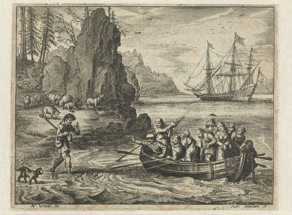 Curator: This engraving, attributed to Isaac Weissenbruch and dated roughly between 1836 and 1912, depicts a group of men on a boat hoisting a flag. Editor: My immediate impression is one of clandestine activity. The stark lines and restricted palette give it a secretive, almost rebellious mood. The figures are densely packed, suggesting urgency and collective action. Curator: Indeed. The text emblazoned on the flag, "De Sabbathbreekster," which translates to "The Sabbath Breaker," adds another layer of intrigue. This connects to a specific socio-religious context. Consider the meaning ascribed to the Sabbath, rest and worship. What does it mean to publicly break it, and who would celebrate that act? Editor: Precisely! Flags are fascinating symbols, and this one broadcasts a clear, albeit subversive, message. Visually, the flag becomes a symbol of resistance or defiance against religious law. The figures, by hoisting it, embody a shared identity rooted in this defiance. Who exactly they are, though, remains unclear. Curator: That's where material context becomes key. Given Weissenbruch's focus on the daily life of ordinary people, the print suggests a communal event, perhaps related to labor practices or political protest. Think of it as an image about access: access to labor and leisure, maybe even resistance against restrictive religious norms upheld by societal powers. Editor: And the water itself! The medium carrying the 'breakers', fluid and uncontrollable, reflecting both potential and instability. Even the choice to render it in engraving--a medium historically associated with distributing information and creating multiple copies--underscores its potential for widespread influence and perhaps instigation. Curator: Yes, engraving made it an affordable artwork at that time, a potentially radical message circulating for all to see, printed again and again...it shifts the status of the image away from rarefied "high art", embedding it within everyday visual culture and political discourse. It's not just *what* it represents but *how* it became representation itself, manufactured, multiplied, distributed, maybe pasted to walls... Editor: What lingers with me is this rather potent declaration of breaking from convention; it raises enduring questions about authority and collective rebellion. What sacred cows do we collectively challenge, or uphold, today? Curator: For me, understanding the technical process and historical backdrop illuminates the socio-political message. The engraving is not just a picture, but a manufactured object of rebellion, disseminated in its time, and now resonating differently, if subtly, even today.