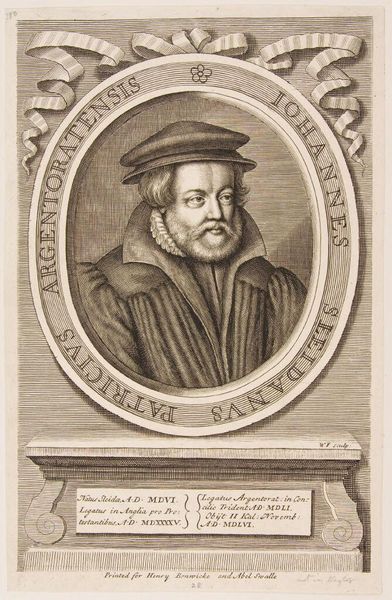 Editor: This is a portrait of Viglius de Lummen a Marck by Crispijn de Passe, created sometime around the late 16th or early 17th century. It's an engraving, and the detail is incredible. I'm struck by the almost ghostly figures in the background. What can you tell me about this piece? Curator: Look closely at the context of the time. The figure, the ghost-like figures, the inscription…what power structures are at play here? The subject's attire and the coat of arms speak to nobility, yet there's a fragility, a vulnerability hinted at by the background figures. Consider how class and religious tensions shaped the era, and whose stories are often left untold in these portrayals. Editor: So, it's not just about depicting an individual, but about unpacking the society they lived in? Curator: Precisely. It's about interrogating the narratives of power and how they are visually constructed and reinforced. Editor: I see it now. Thanks! Curator: It's been a pleasure.